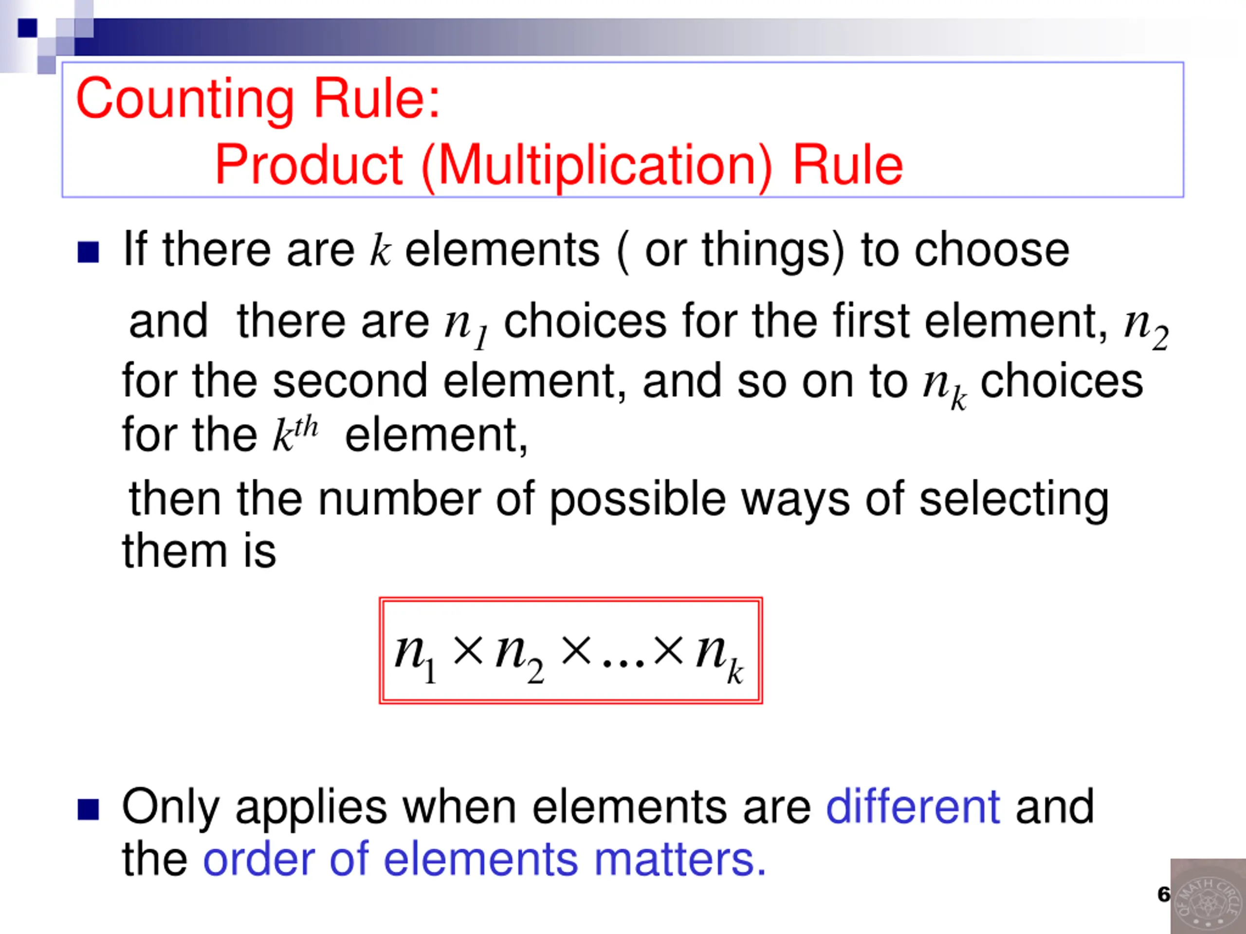 Counting Rule: Product (Multiplication) Rule If there are k elements ( or things) to choose and there are n1 choices for the first element, n2 for the second element, and so on to nk choices for the kthelement, then the number of possible ways of selecting them is n n 2 ... n 1 k Only applies when elements are different and the order of elements matters. 6