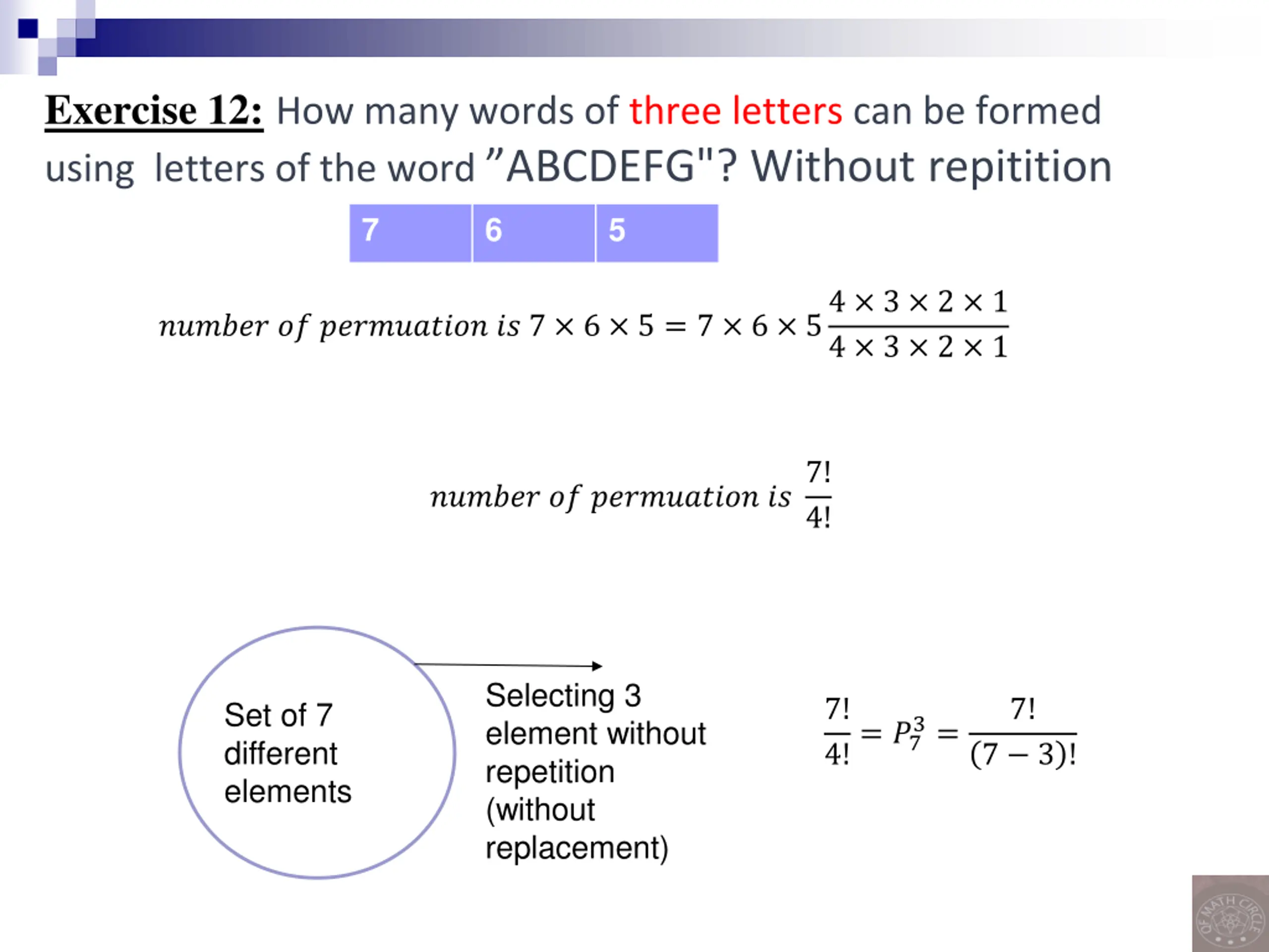 Exercise 12:How many words of three letters can be formed using letters of the word ABCDEFG"? Without repitition 7 6 5 ?????? ?? ?????????? ?? 7 6 5 = 7 6 54 3 2 1 4 3 2 1 ?????? ?? ?????????? ??7! 4! Selecting 3 element without repetition (without replacement) 7! 4!= ?7 7! Set of 7 different elements 3= 7 3 !