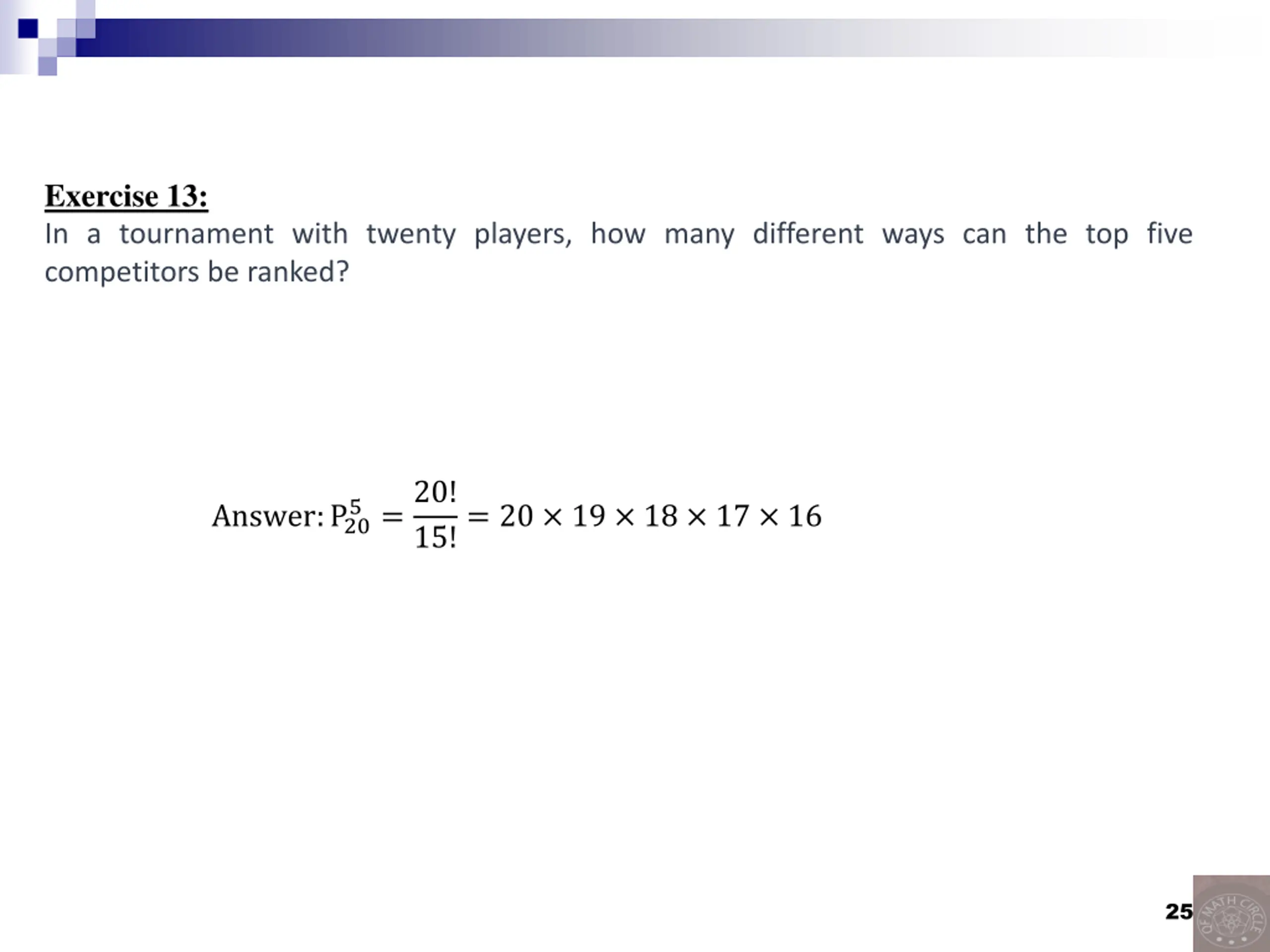 Exercise 13: In a tournament with twenty players, how many different ways can the top five competitors be ranked? 5=20! Answer:P20 15!= 20 19 18 17 16 25