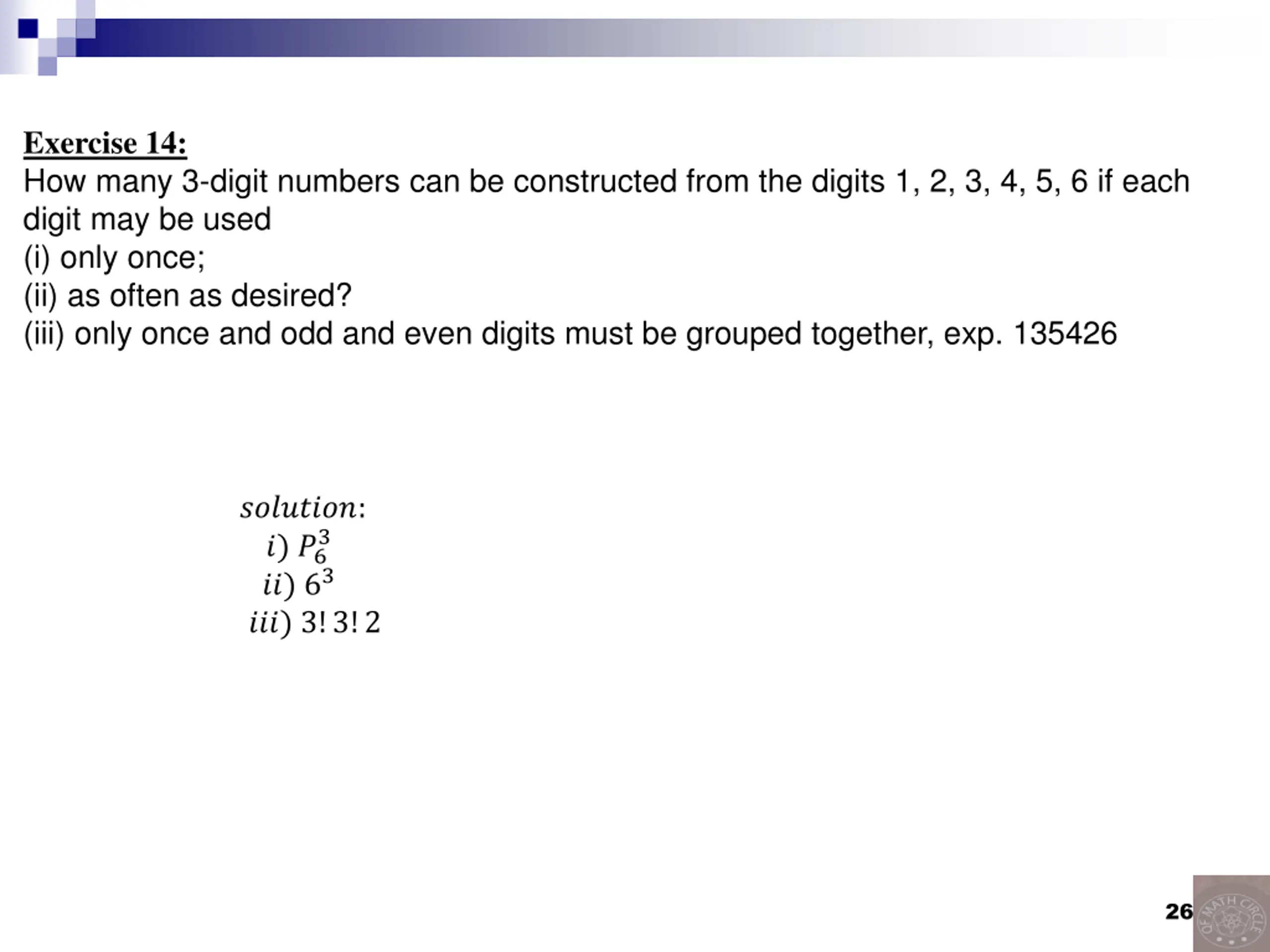 Exercise 14: How many 3-digit numbers can be constructed from the digits 1, 2, 3, 4, 5, 6 if each digit may be used (i) only once; (ii) as often as desired? (iii) only once and odd and even digits must be grouped together, exp. 135426 ????????: ?) ?6 ??) 63 ???) 3!3!2 3 26