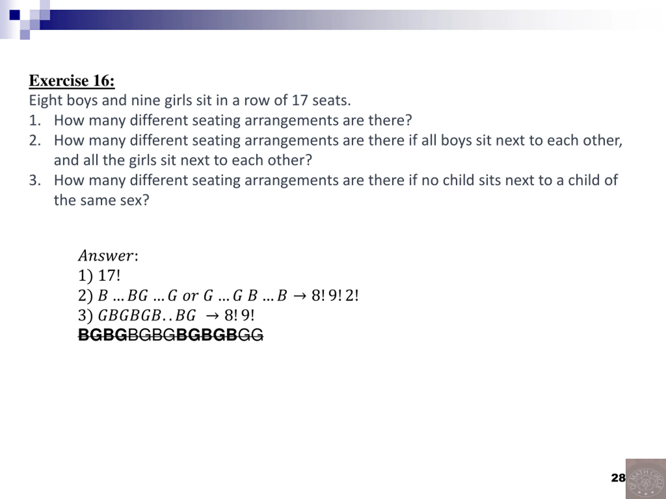 Exercise 16: Eight boys and nine girls sit in a row of 17 seats. 1. How many different seating arrangements are there? 2. How many different seating arrangements are there if all boys sit next to each other, and all the girls sit next to each other? 3. How many different seating arrangements are there if no child sits next to a child of the same sex? ??????: 1) 17! 2) ? ?? ? ?? ? ? ? ? 8!9!2! 3) ??????..?? 8!9! BGBGBGBGBGBGBGG 28