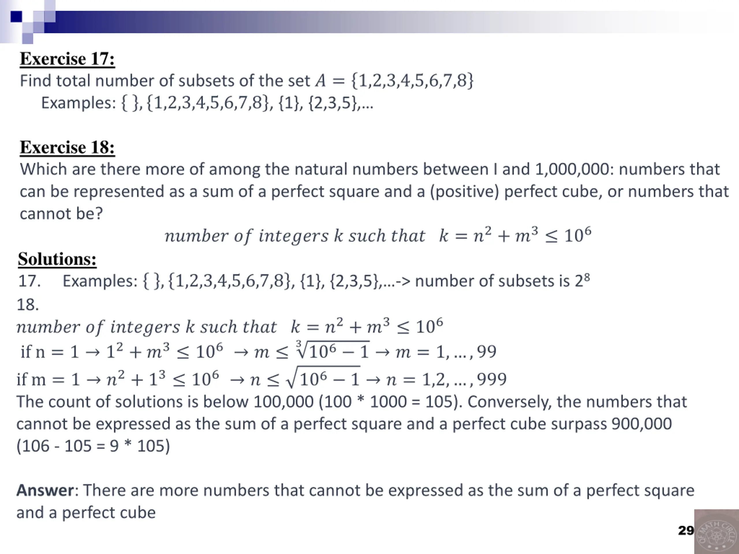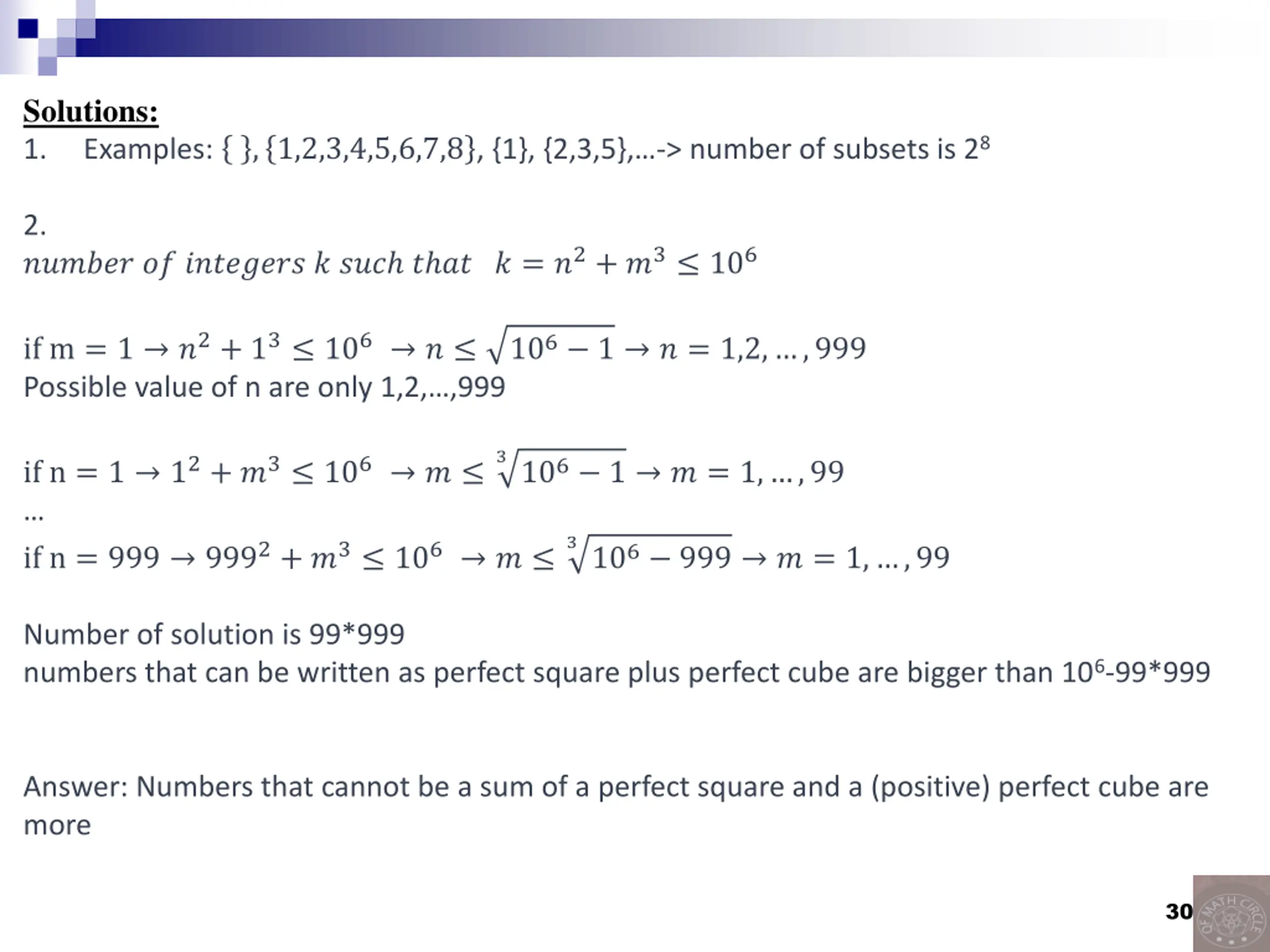 Solutions: 1. Examples: , 1,2,3,4,5,6,7,8 , {1}, {2,3,5}, -> number of subsets is 28 2. ?????? ?? ???????? ? ??? ? ?? ? = ?2+ ?3 106 if m = 1 ?2+ 13 106 ? Possible value of n are only 1,2, ,999 106 1 ? = 1,2, ,999 3106 1 ? = 1, ,99 if n = 1 12+ ?3 106 ? if n = 999 9992+ ?3 106 ? 3106 999 ? = 1, ,99 Number of solution is 99*999 numbers that can be written as perfect square plus perfect cube are bigger than 106-99*999 Answer: Numbers that cannot be a sum of a perfect square and a (positive) perfect cube are more 30
