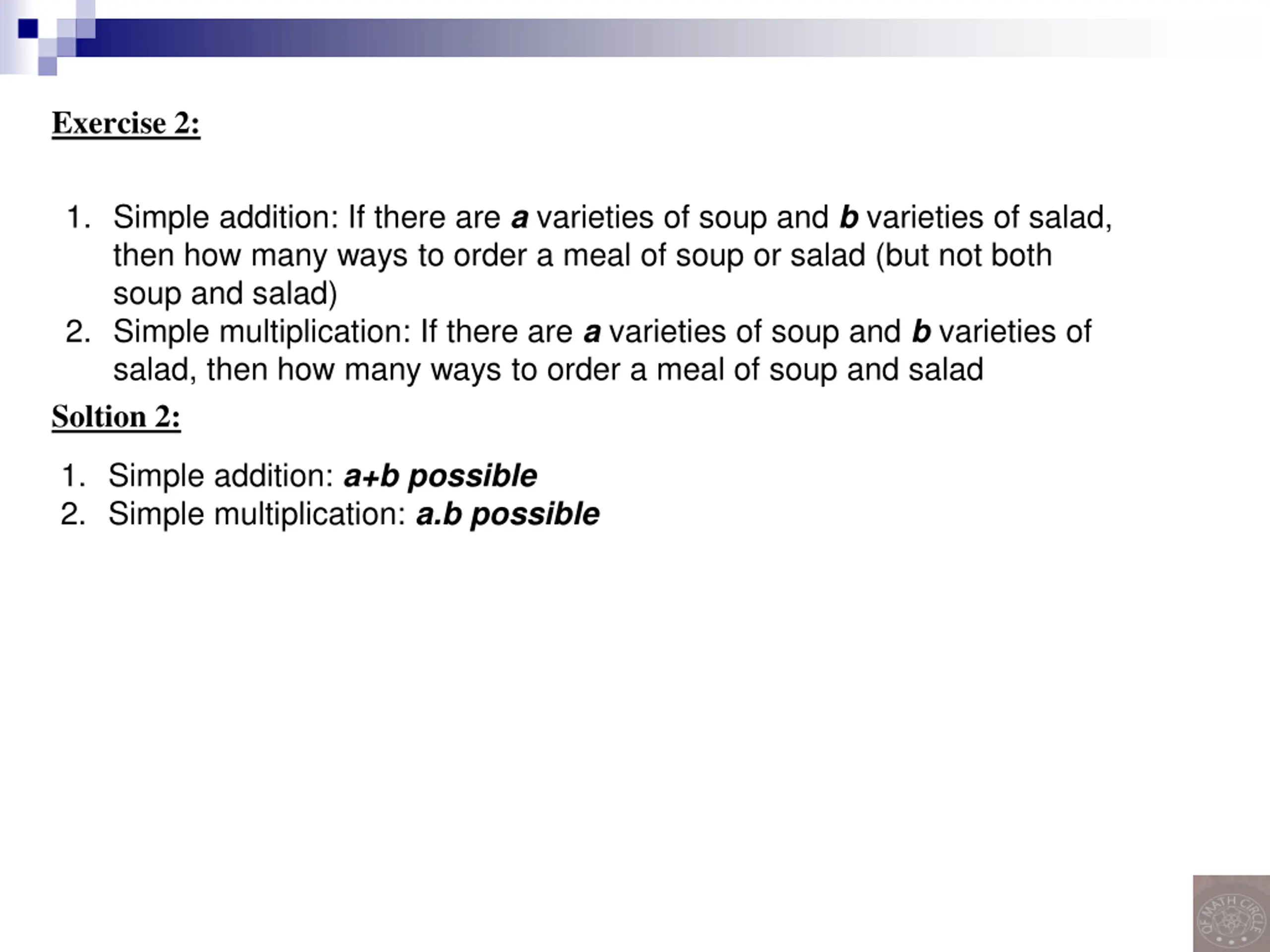 Exercise 2: 1. Simple addition: If there are a varieties of soup and b varieties of salad, then how many ways to order a meal of soup or salad (but not both soup and salad) 2. Simple multiplication: If there are a varieties of soup and b varieties of salad, then how many ways to order a meal of soup and salad Soltion 2: 1. Simple addition: a+b possible 2. Simple multiplication: a.b possible