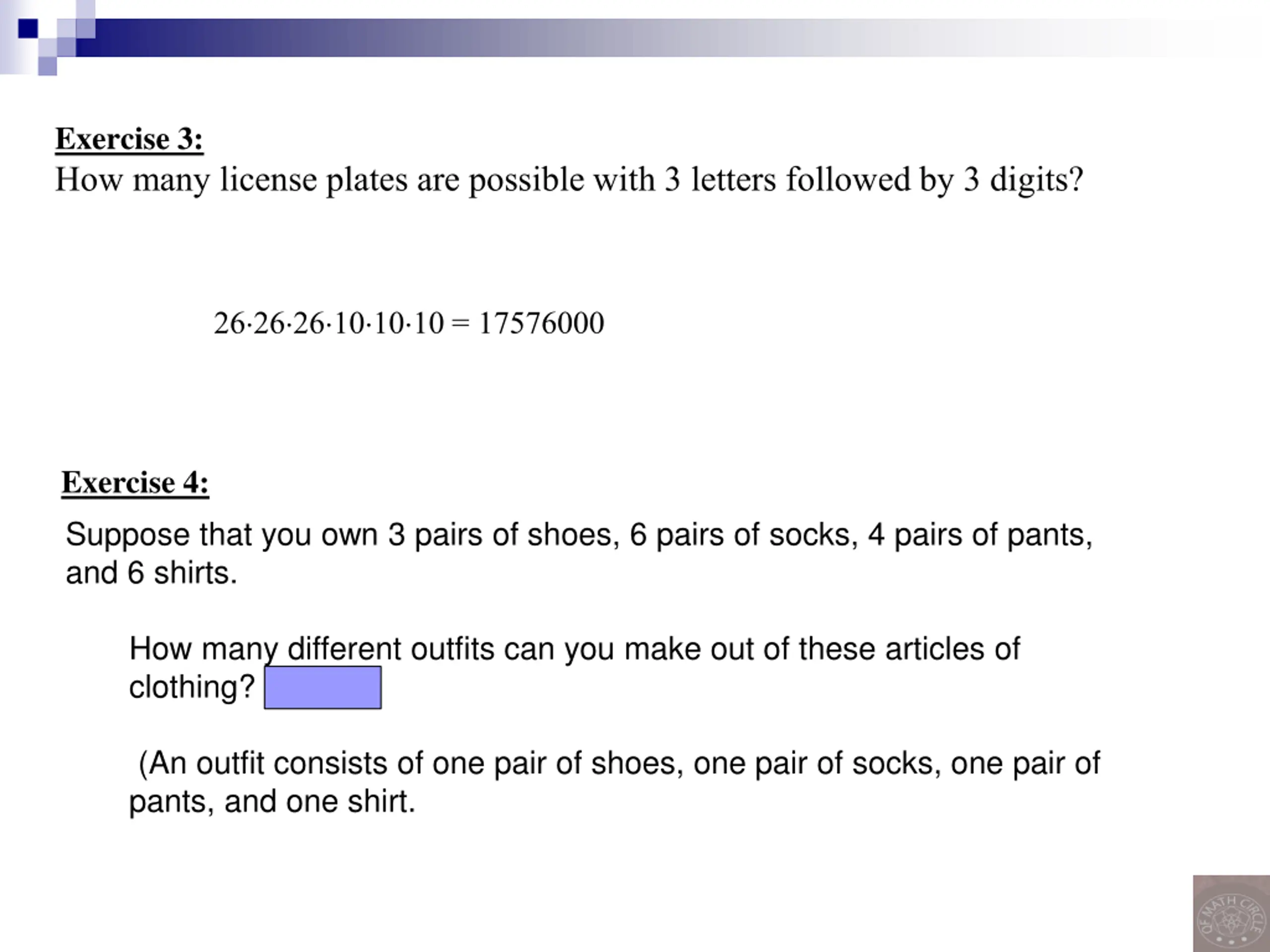 Exercise 3: How many license plates are possible with 3 letters followed by 3 digits? 26 26 26 10 10 10 = 17576000 Exercise 4: Suppose that you own 3 pairs of shoes, 6 pairs of socks, 4 pairs of pants, and 6 shirts. How many different outfits can you make out of these articles of clothing? 3*6*4*6 (An outfit consists of one pair of shoes, one pair of socks, one pair of pants, and one shirt.