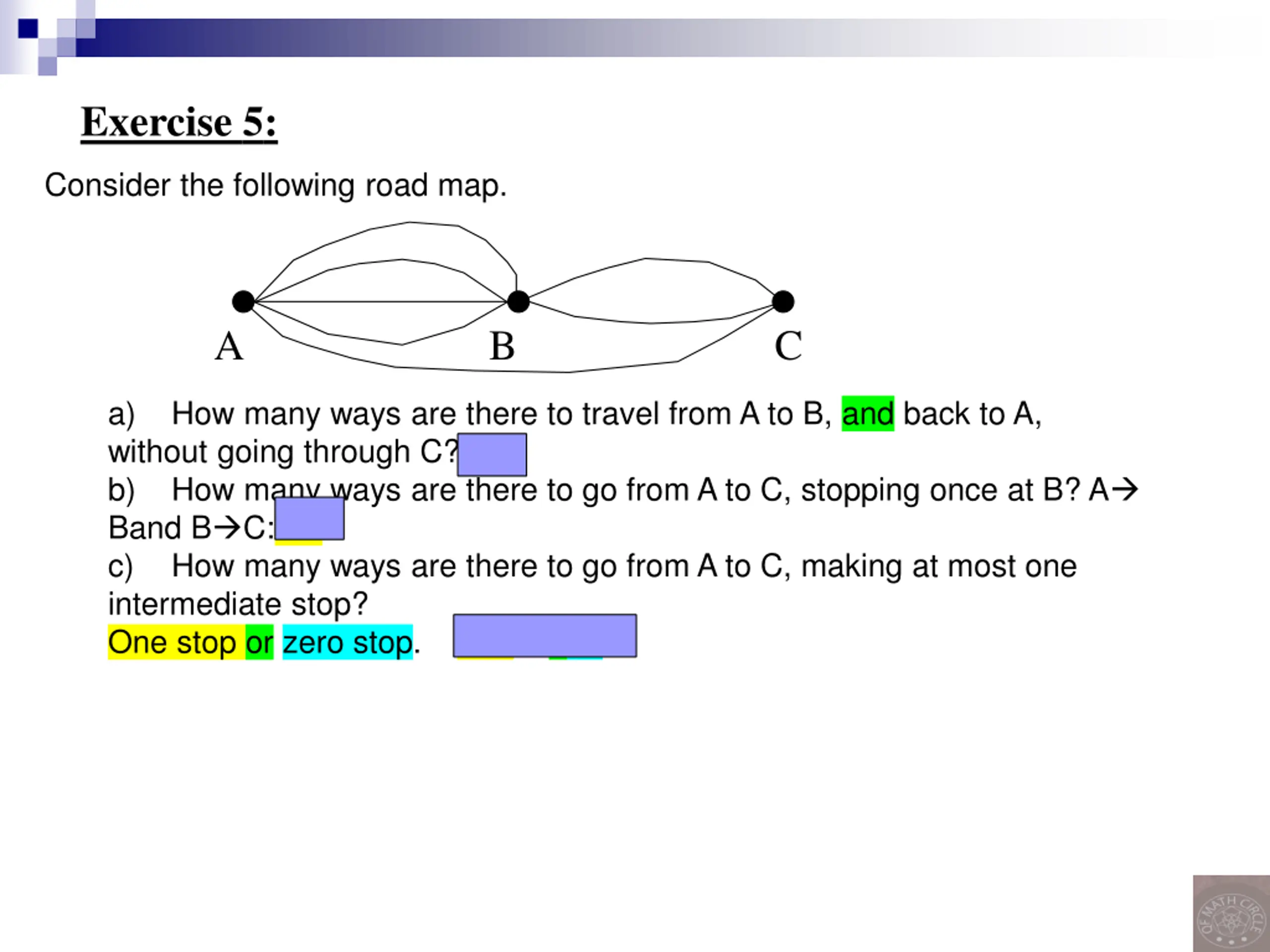 Exercise 5: Consider the following road map. A B C a) How many ways are there to travel from A to B, and back to A, without going through C?4*4 b) How many ways are there to go from A to C, stopping once at B? A Band B C:4*2 c) How many ways are there to go from A to C, making at most one intermediate stop? One stop or zero stop. 4*2 + 1.