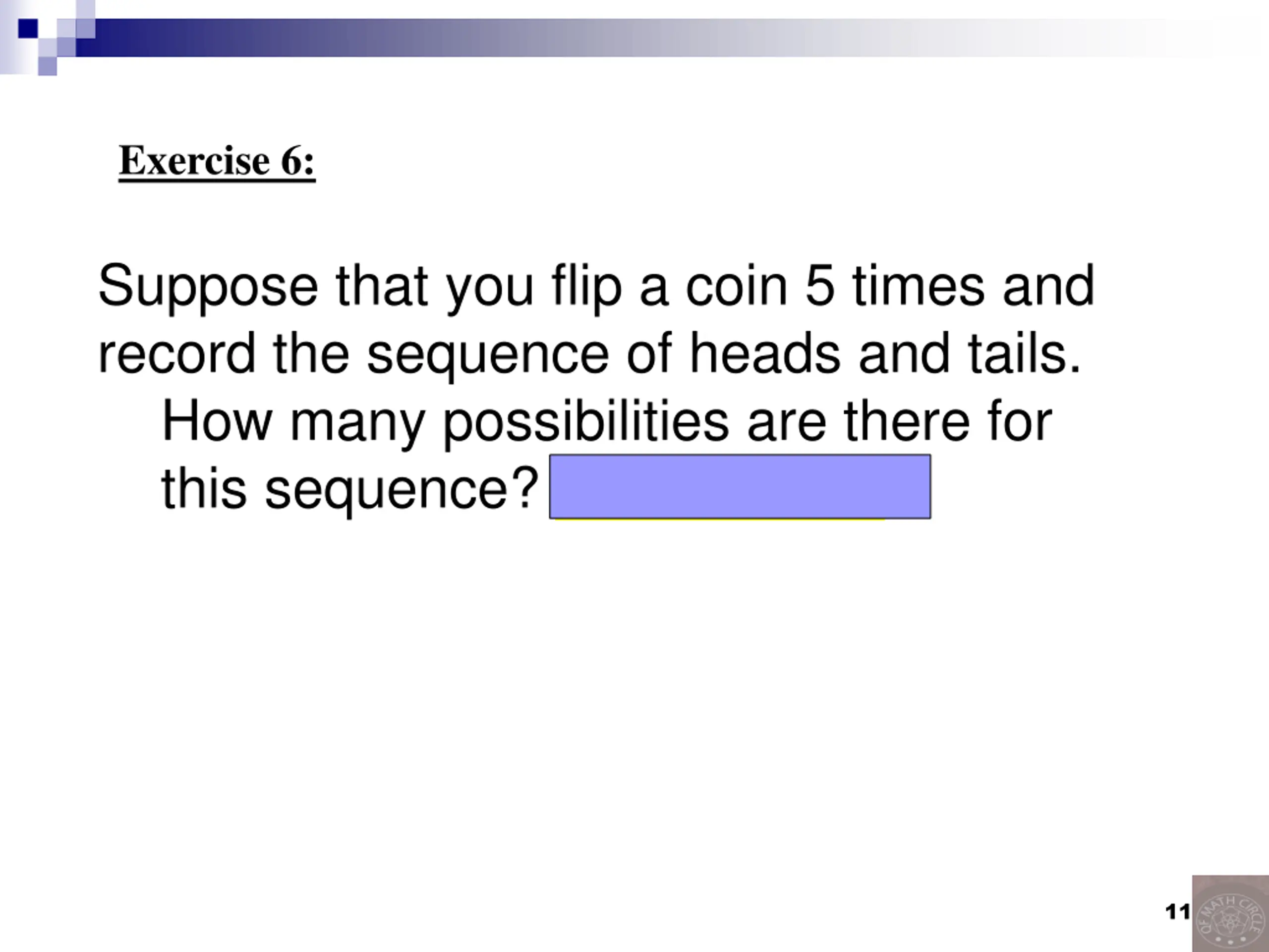 Exercise 6: Suppose that you flip a coin 5 times and record the sequence of heads and tails. How many possibilities are there for this sequence? 2*2*2*2*2=25 11