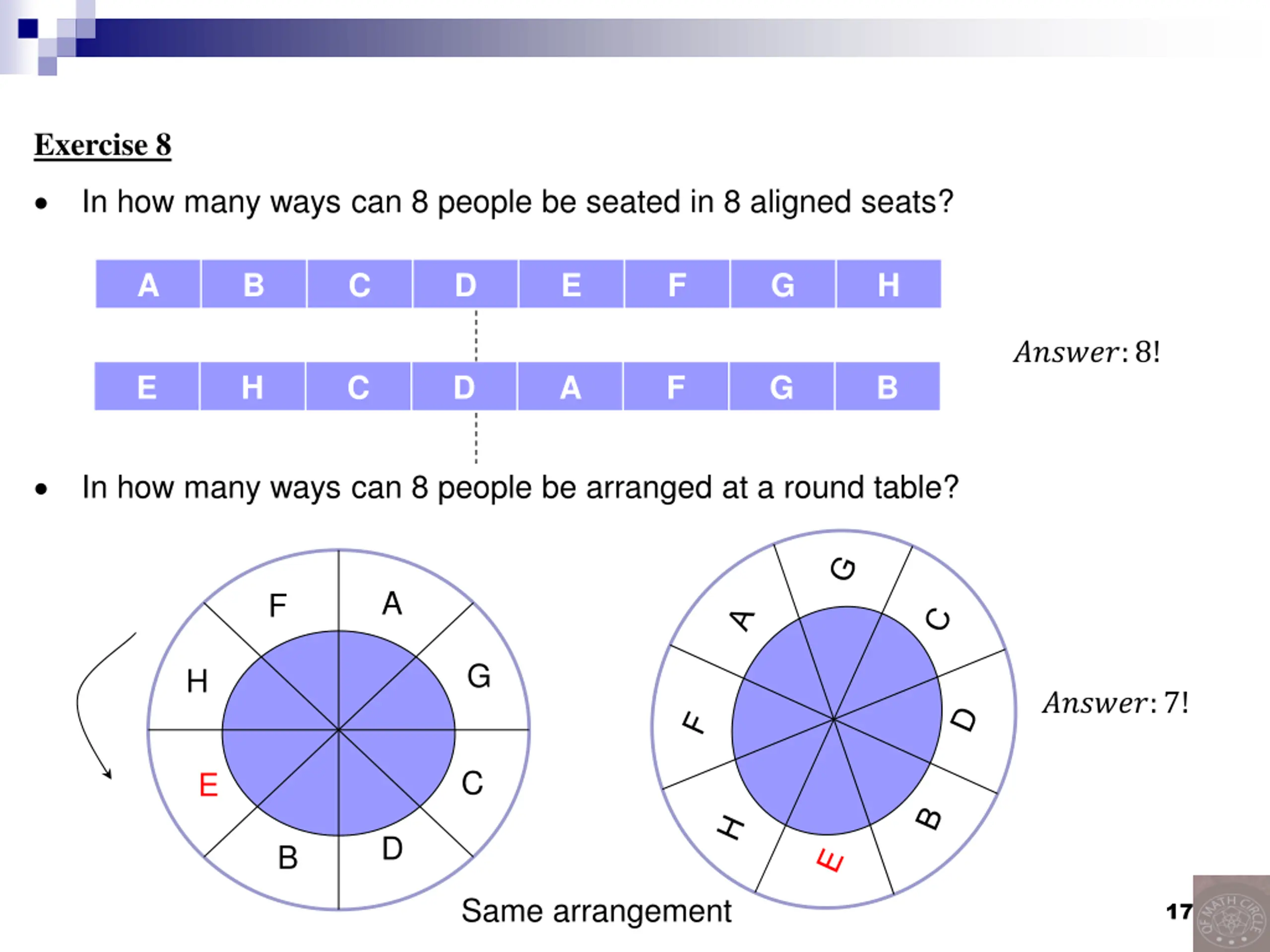 Exercise 8 In how many ways can 8 people be seated in 8 aligned seats? A B C D E F G H ??????:8! E H C D A F G B In how many ways can 8 people be arranged at a round table? A F G H ??????:7! C E D B Same arrangement 17