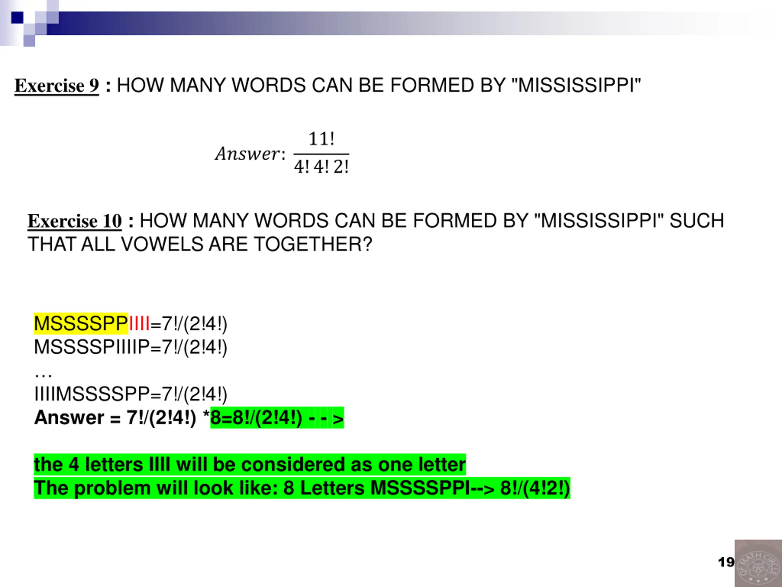 Exercise 9 : HOW MANY WORDS CAN BE FORMED BY "MISSISSIPPI" 11! ??????: 4!4!2! Exercise 10 : HOW MANY WORDS CAN BE FORMED BY "MISSISSIPPI" SUCH THAT ALL VOWELS ARE TOGETHER? MSSSSPPIIII=7!/(2!4!) MSSSSPIIIIP=7!/(2!4!) IIIIMSSSSPP=7!/(2!4!) Answer = 7!/(2!4!) *8=8!/(2!4!) - - > the 4 letters IIII will be considered as one letter The problem will look like: 8 Letters MSSSSPPI--> 8!/(4!2!) 19