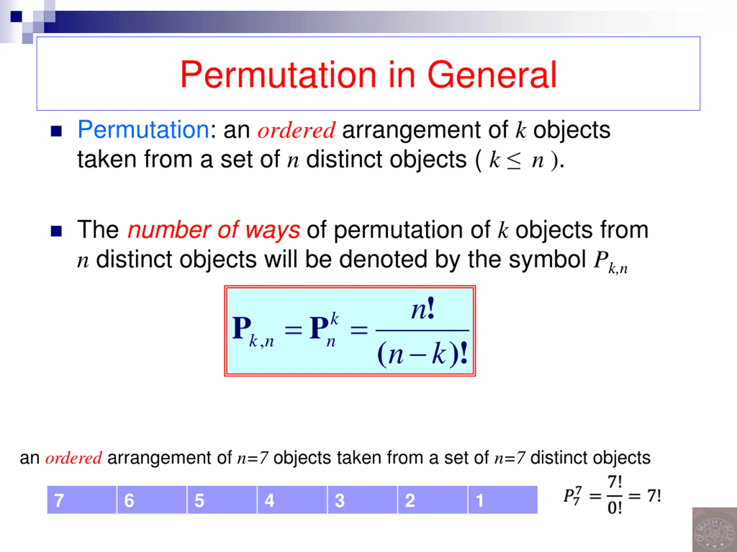 Permutation in General Permutation: an ordered arrangement of k objects taken from a set of n distinct objects ( k n ). The number of ways of permutation of k objects from n distinct objects will be denoted by the symbol Pk,n ! n = = k n P P , k n ( )! n k an ordered arrangement of n=7 objects taken from a set of n=7 distinct objects 7 6 5 4 3 2 1