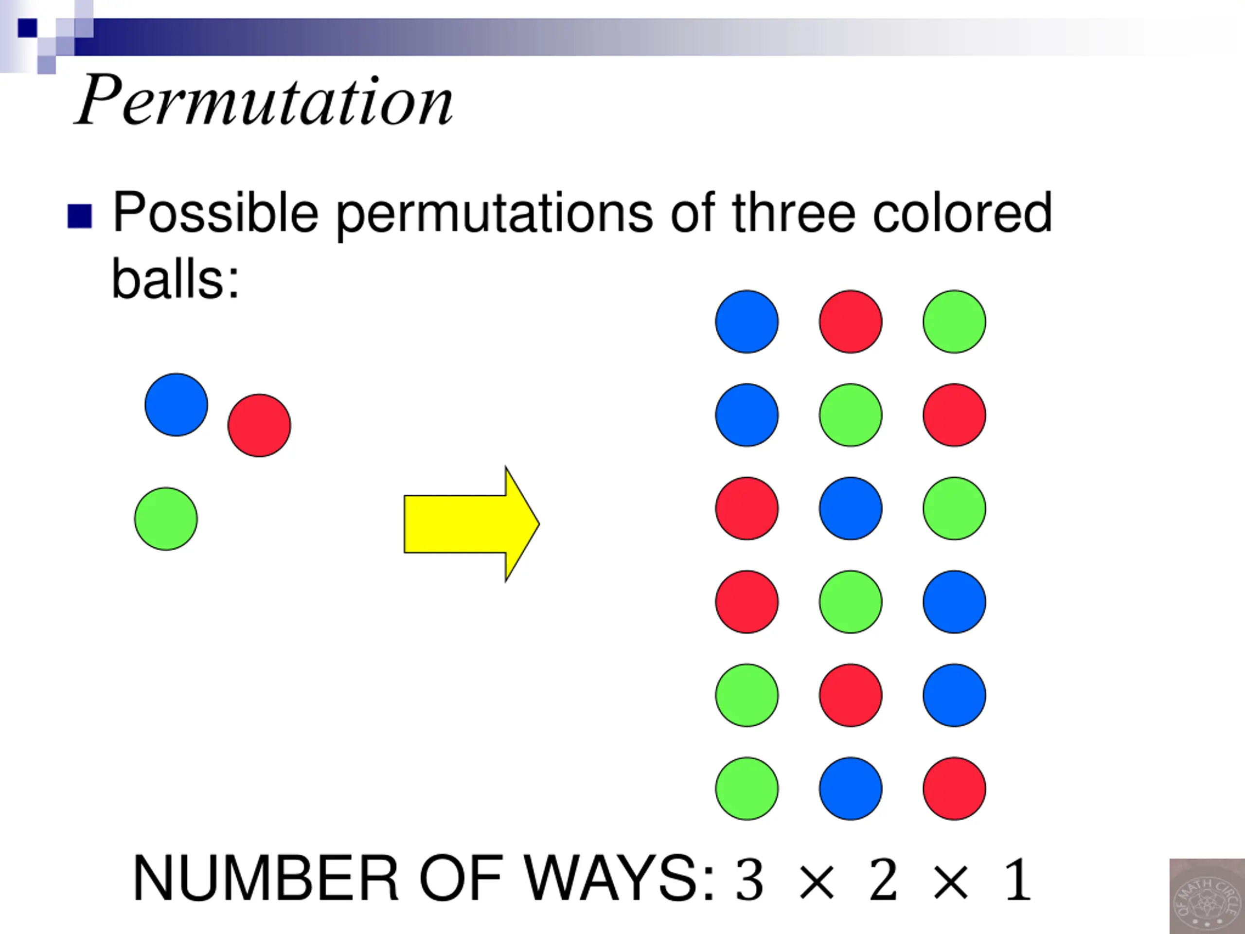Permutation Possible permutations of three colored balls: NUMBER OF WAYS: 3 2 1