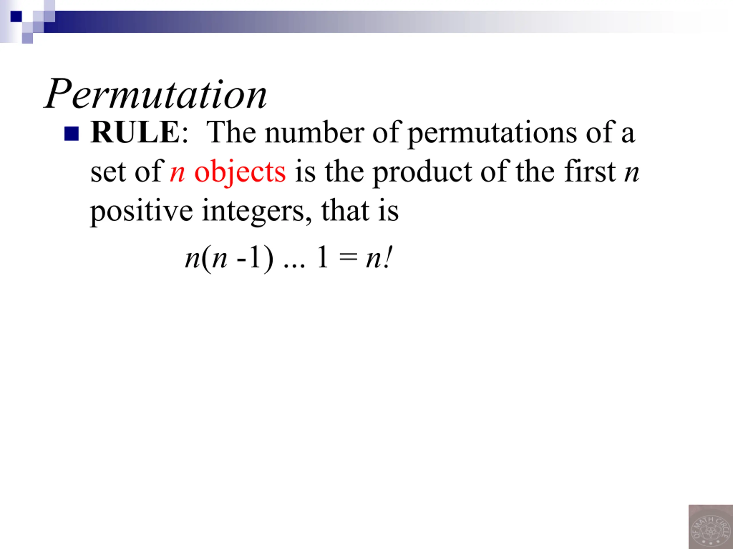 Permutation RULE: The number of permutations of a set of n objects is the product of the first n positive integers, that is n(n -1) ... 1 = n!