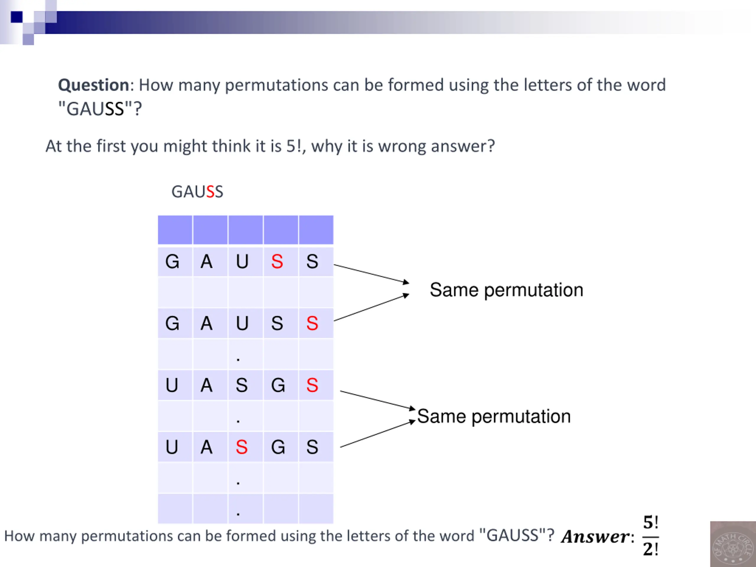 Question: How many permutations can be formed using the letters of the word "GAUSS"? At the first you might think it is 5!, why it is wrong answer? GAUSS G A U S S Same permutation G A U . S . S . . S S U A G S Same permutation U A G S How many permutations can be formed using the letters of the word "GAUSS"???????:?! ?!
