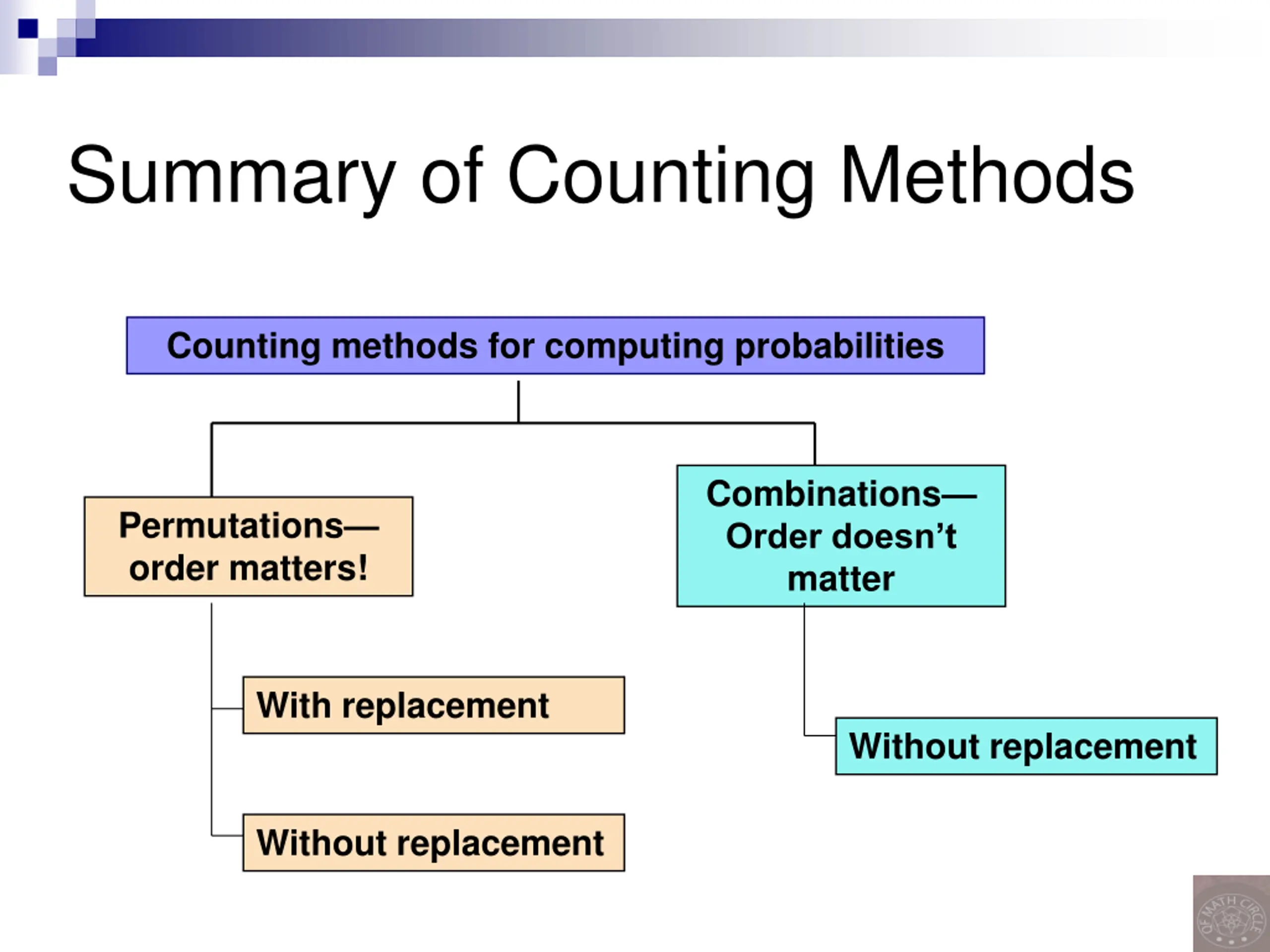 Summary of Counting Methods Counting methods for computing probabilities Combinations Order doesn t matter Permutations order matters! With replacement Without replacement Without replacement