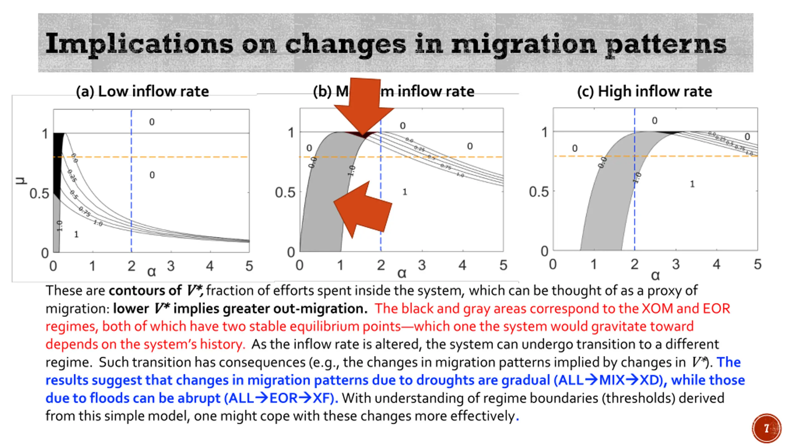 Implications on changes in migration patterns (a) Low inflow rate (b) Medium inflow rate (c) High inflow rate These are contours of V*, migration: lower V* regimes, both of which have two stable equilibrium points which one the system would gravitate toward depends on the system s history. As the inflow rate is altered, the system can undergo transition to a different regime. Such transition has consequences (e.g., the changes in migration patterns implied by changes in V*). The results suggest that changes in migration patterns due to droughts are gradual (ALL due to floods can be abrupt (ALL EOR XF). With understanding of regime boundaries (thresholds) derived from this simple model, one might cope with these changes more effectively. V*, fraction of efforts spent inside the system, which can be thought of as a proxy of V* implies greater out-migration. The black and gray areas correspond to the XOM and EOR MIX XD), while those 6