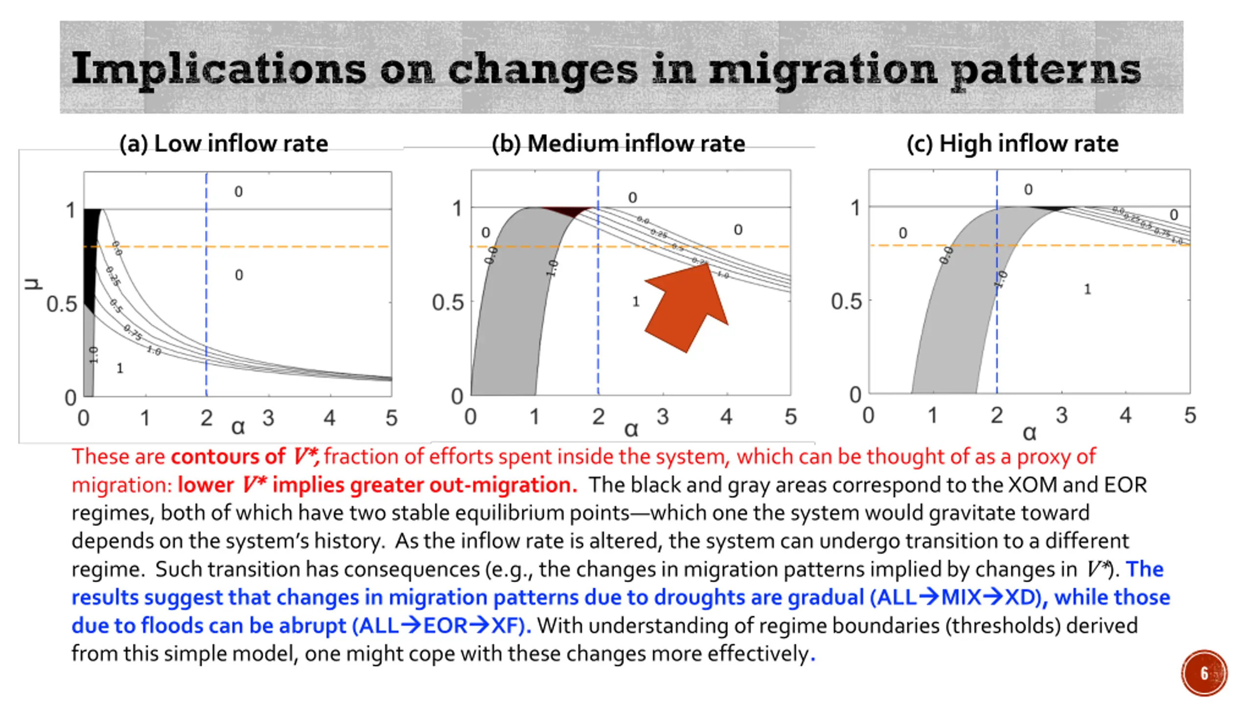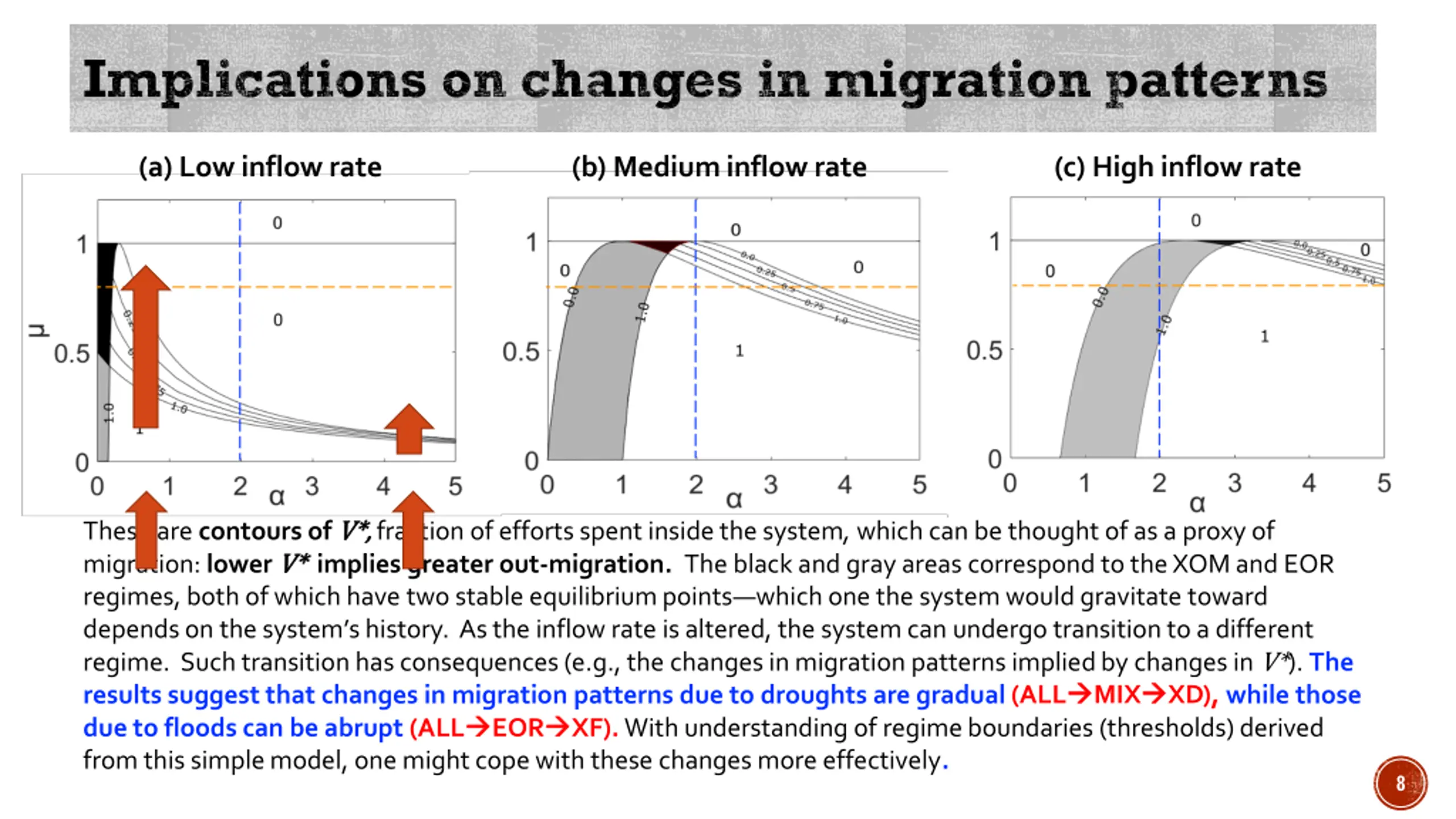 Implications on changes in migration patterns (a) Low inflow rate (b) Medium inflow rate (c) High inflow rate These are contours of V*, migration: lower V* regimes, both of which have two stable equilibrium points which one the system would gravitate toward depends on the system s history. As the inflow rate is altered, the system can undergo transition to a different regime. Such transition has consequences (e.g., the changes in migration patterns implied by changes in V*). The results suggest that changes in migration patterns due to droughts are gradual (ALL due to floods can be abrupt (ALL EOR XF). With understanding of regime boundaries (thresholds) derived from this simple model, one might cope with these changes more effectively. V*, fraction of efforts spent inside the system, which can be thought of as a proxy of V* implies greater out-migration. The black and gray areas correspond to the XOM and EOR MIX XD), while those 7