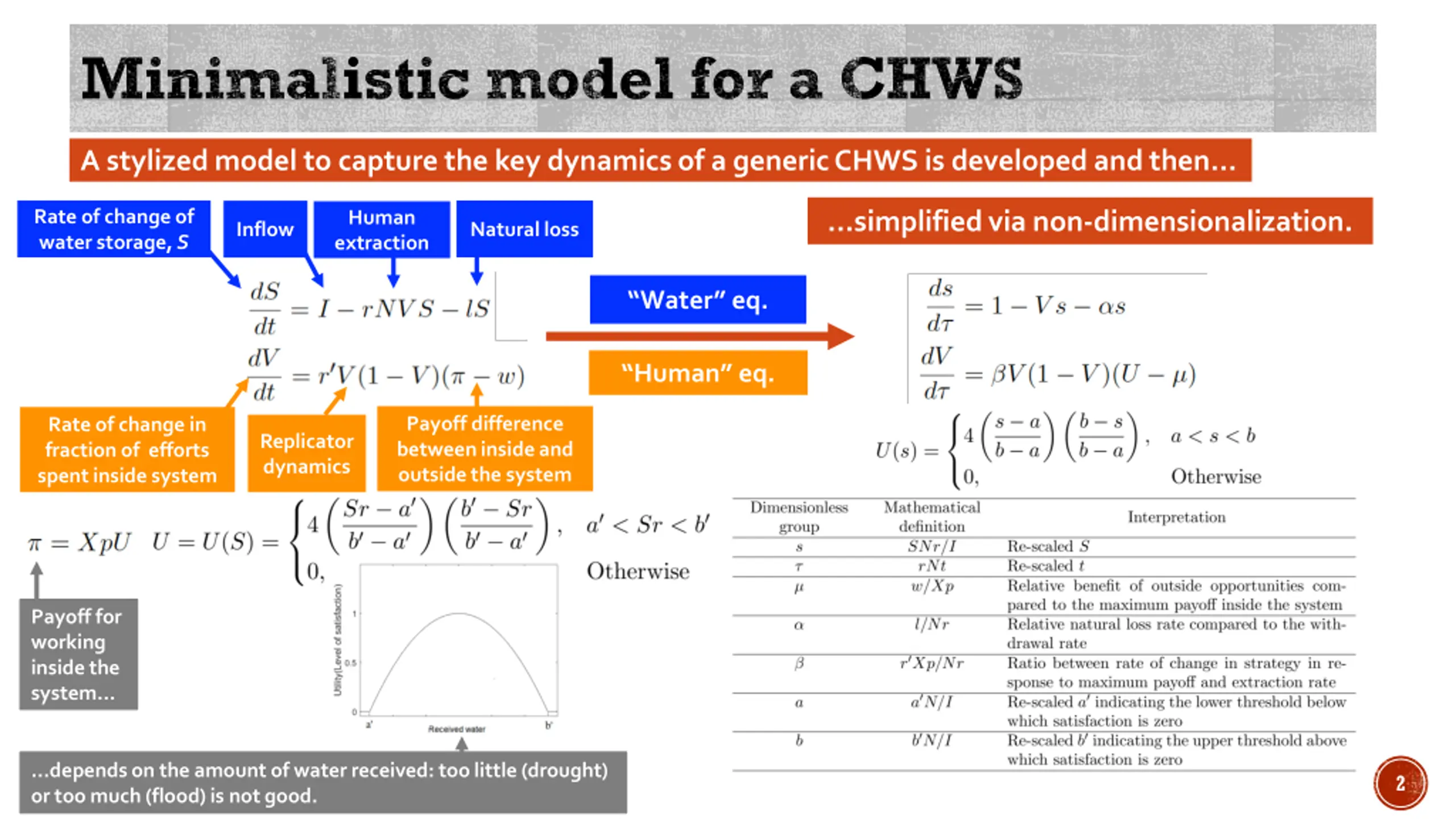 Minimalistic model for a CHWS A stylized model to capture the key dynamics of a generic CHWS is developed and then Rate of change of water storage, S Human extraction simplified via non-dimensionalization. Natural loss Inflow Water eq. Human eq. Payoff difference between inside and outside the system Rate of change in fraction of efforts spent inside system Replicator dynamics Payoff for working inside the system depends on the amount of water received: too little (drought) or too much (flood) is not good. 2