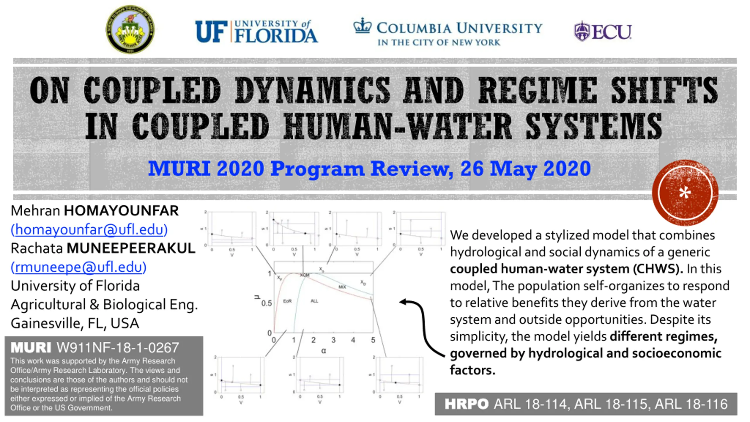 ON COUPLED DYNAMICS AND REGIME SHIFTS IN COUPLED HUMAN-WATER SYSTEMS MURI 2020 Program Review, 26 May 2020 Mehran HOMAYOUNFAR (homayounfar@ufl.edu) Rachata MUNEEPEERAKUL (rmuneepe@ufl.edu) University of Florida Agricultural & Biological Eng. Gainesville, FL, USA We developed a stylized model that combines hydrological and social dynamics of a generic coupled human-water system (CHWS). In this model, The population self-organizes to respond to relative benefits they derive from the water system and outside opportunities. Despite its simplicity, the model yields different regimes, governed by hydrological and socioeconomic factors. MURI MURI W911NF-18-1-0267 This work was supported by the Army Research Office/Army Research Laboratory. The views and conclusions are those of the authors and should not be interpreted as representing the official policies either expressed or implied of the Army Research Office or the US Government. HRPO HRPO ARL 18-114, ARL 18-115, ARL 18-116