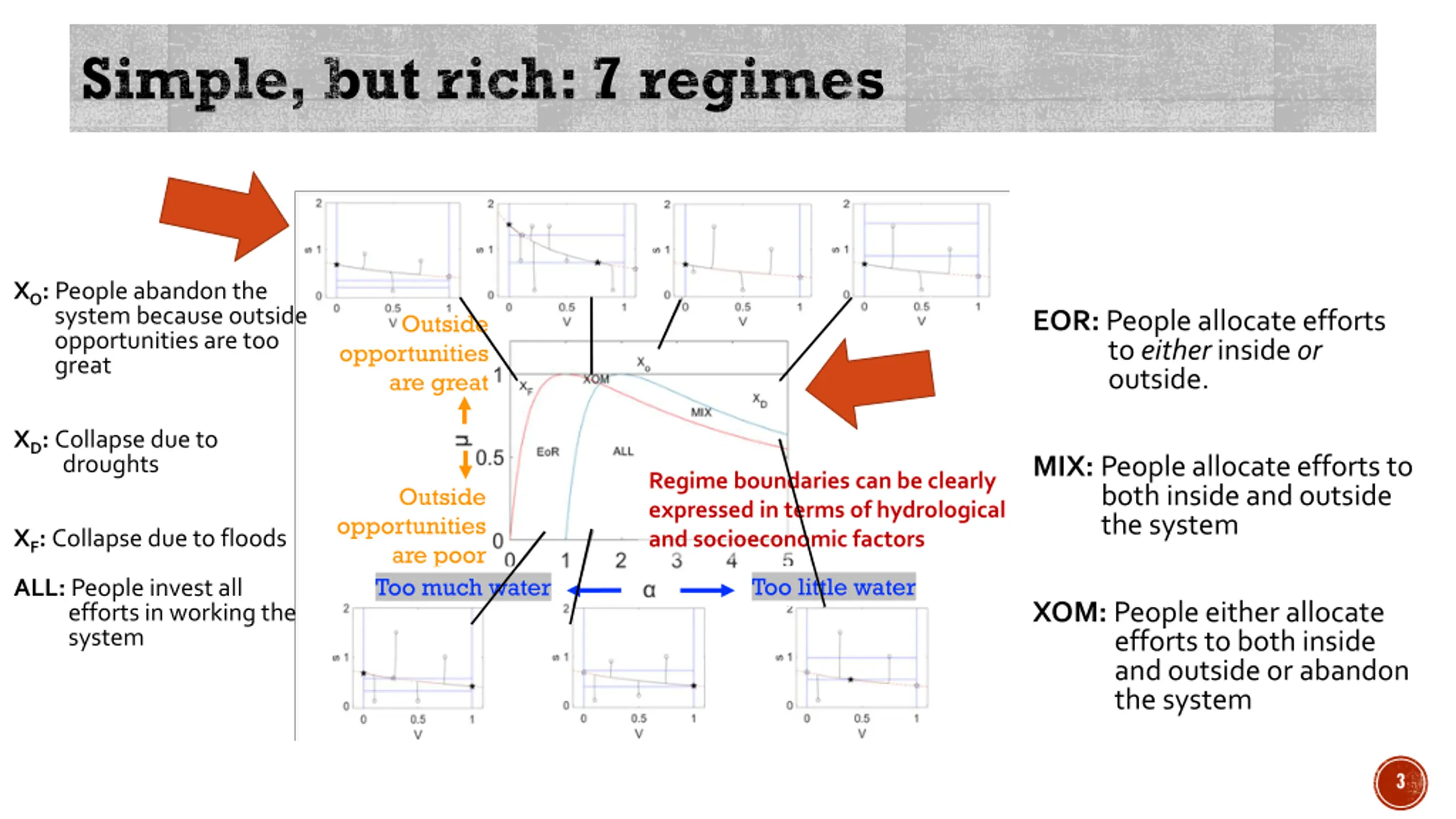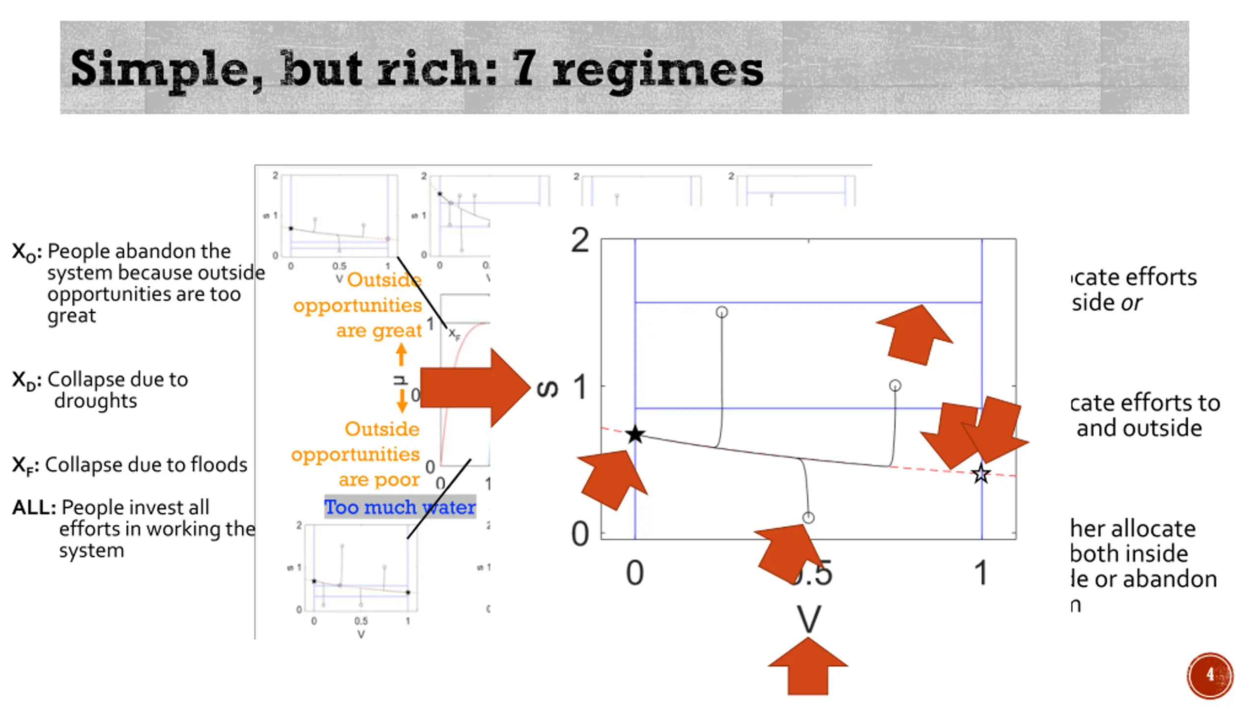 Simple, but rich: 7 regimes XO: People abandon the system because outside opportunities are too great EOR: People allocate efforts to either inside or outside. Outside opportunities are great XD: Collapse due to droughts MIX: People allocate efforts to both inside and outside the system Regime boundaries can be clearly expressed in terms of hydrological and socioeconomic factors Outside opportunities are poor Too much water XF: Collapse due to floods Too little water ALL: People invest all efforts in working the system XOM: People either allocate efforts to both inside and outside or abandon the system 3