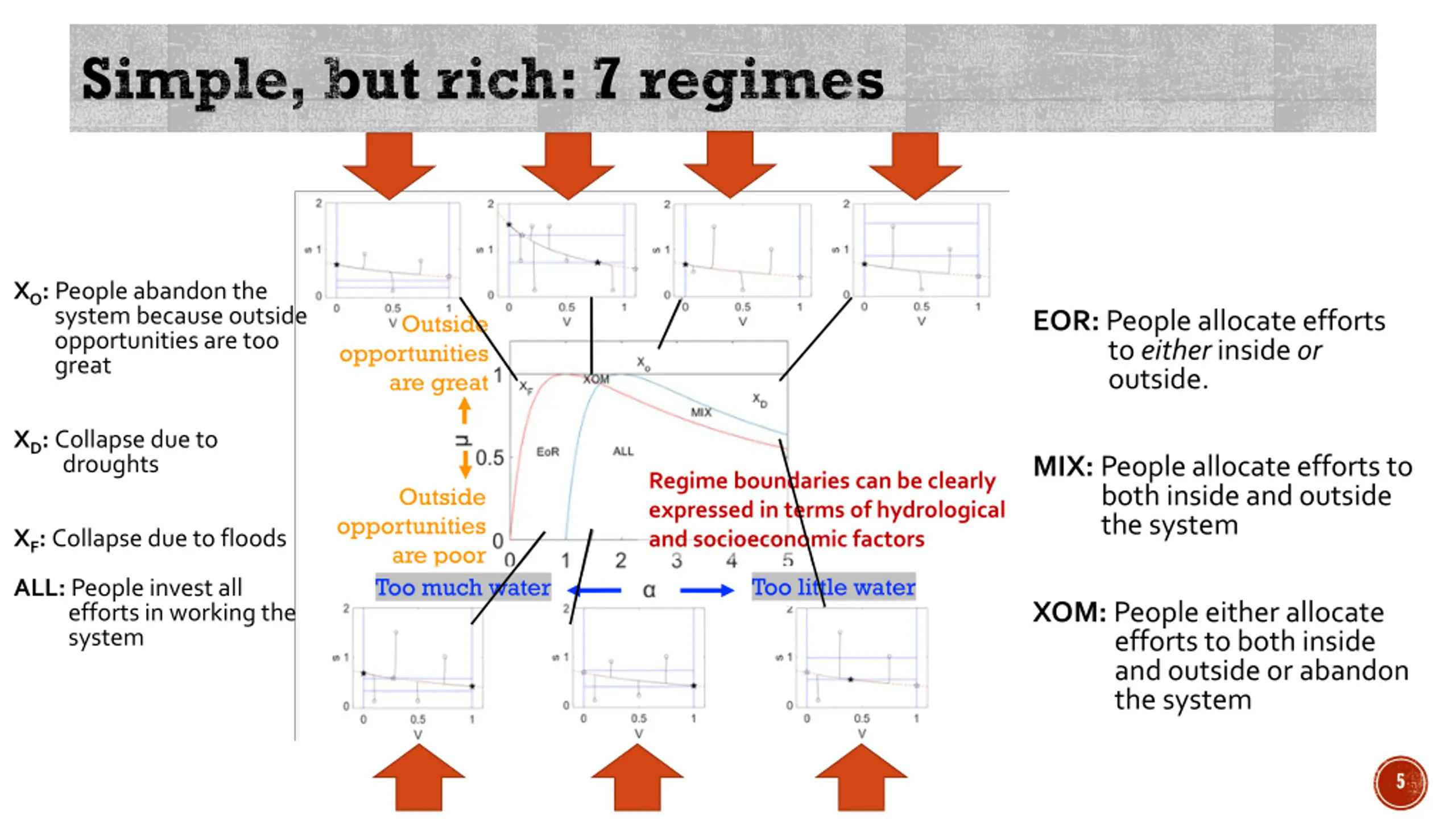 Simple, but rich: 7 regimes XO: People abandon the system because outside opportunities are too great EOR: People allocate efforts to either inside or outside. Outside opportunities are great XD: Collapse due to droughts MIX: People allocate efforts to both inside and outside the system Regime boundaries can be clearly expressed in terms of hydrological and socioeconomic factors Outside opportunities are poor Too much water XF: Collapse due to floods Too little water ALL: People invest all efforts in working the system XOM: People either allocate efforts to both inside and outside or abandon the system 4