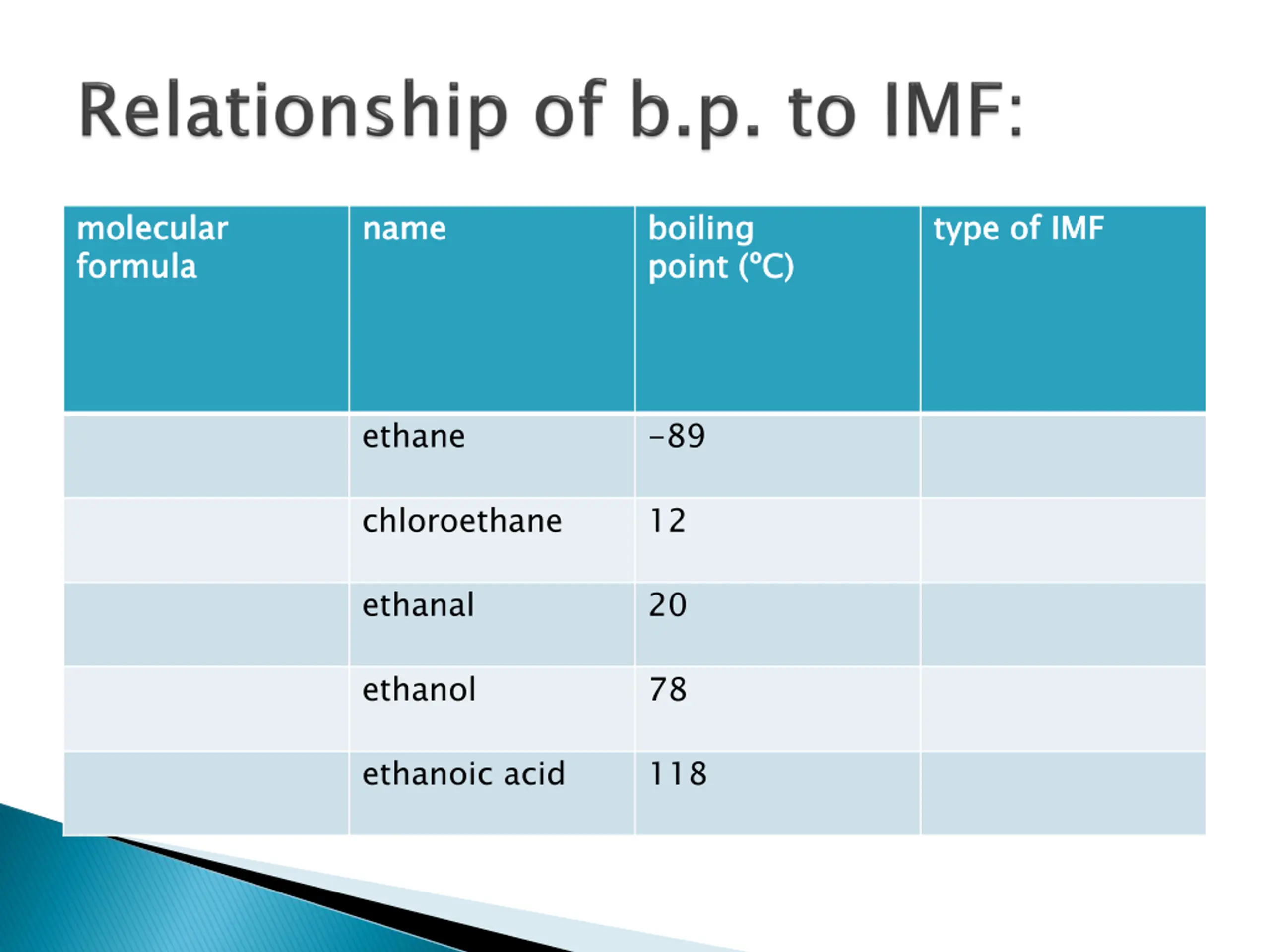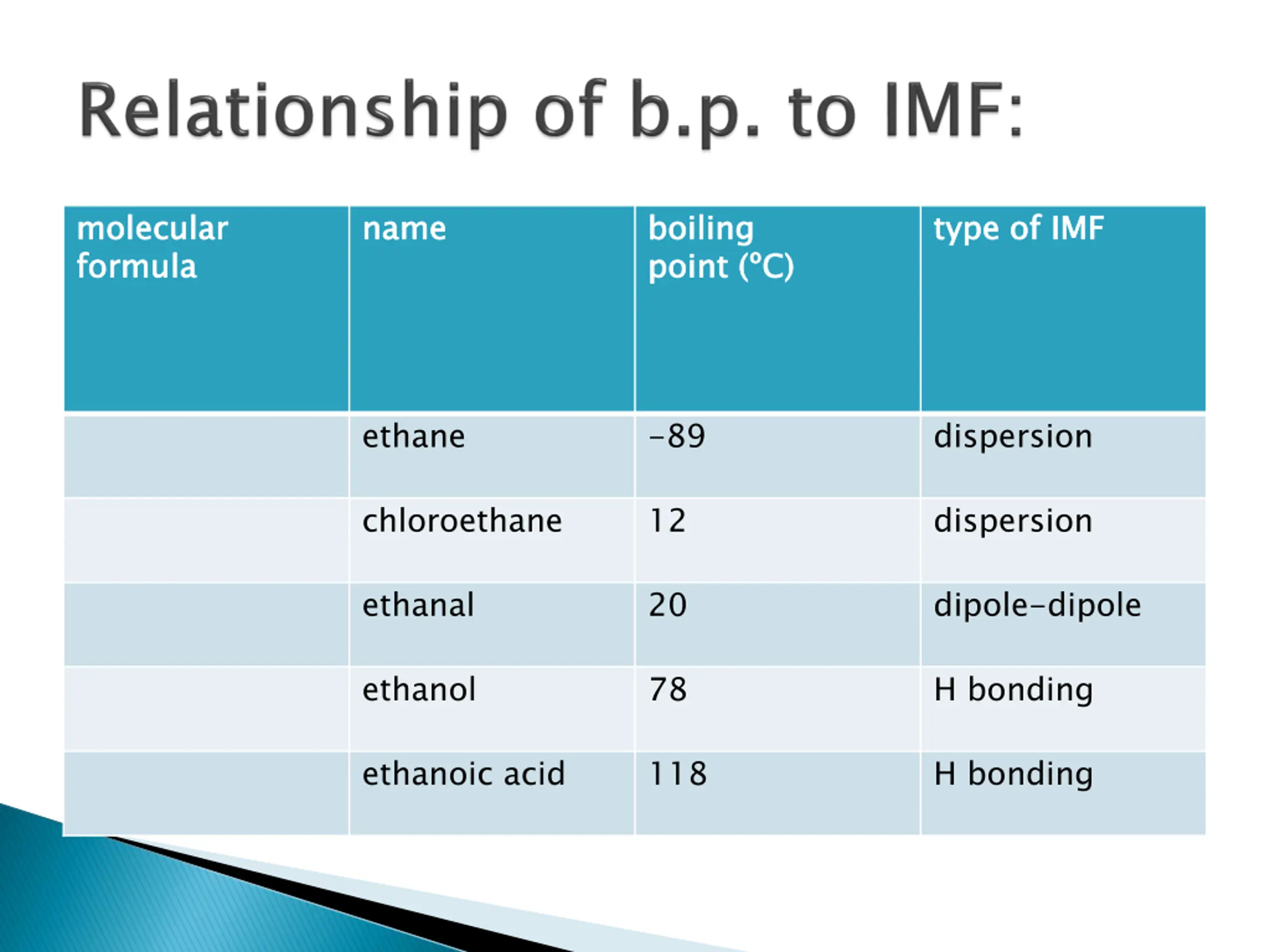 molecular formula molecular formula name name boiling point ( C) boiling point ( C) type of IMF type of IMF ethane -89 chloroethane 12 ethanal 20 ethanol 78 ethanoic acid 118