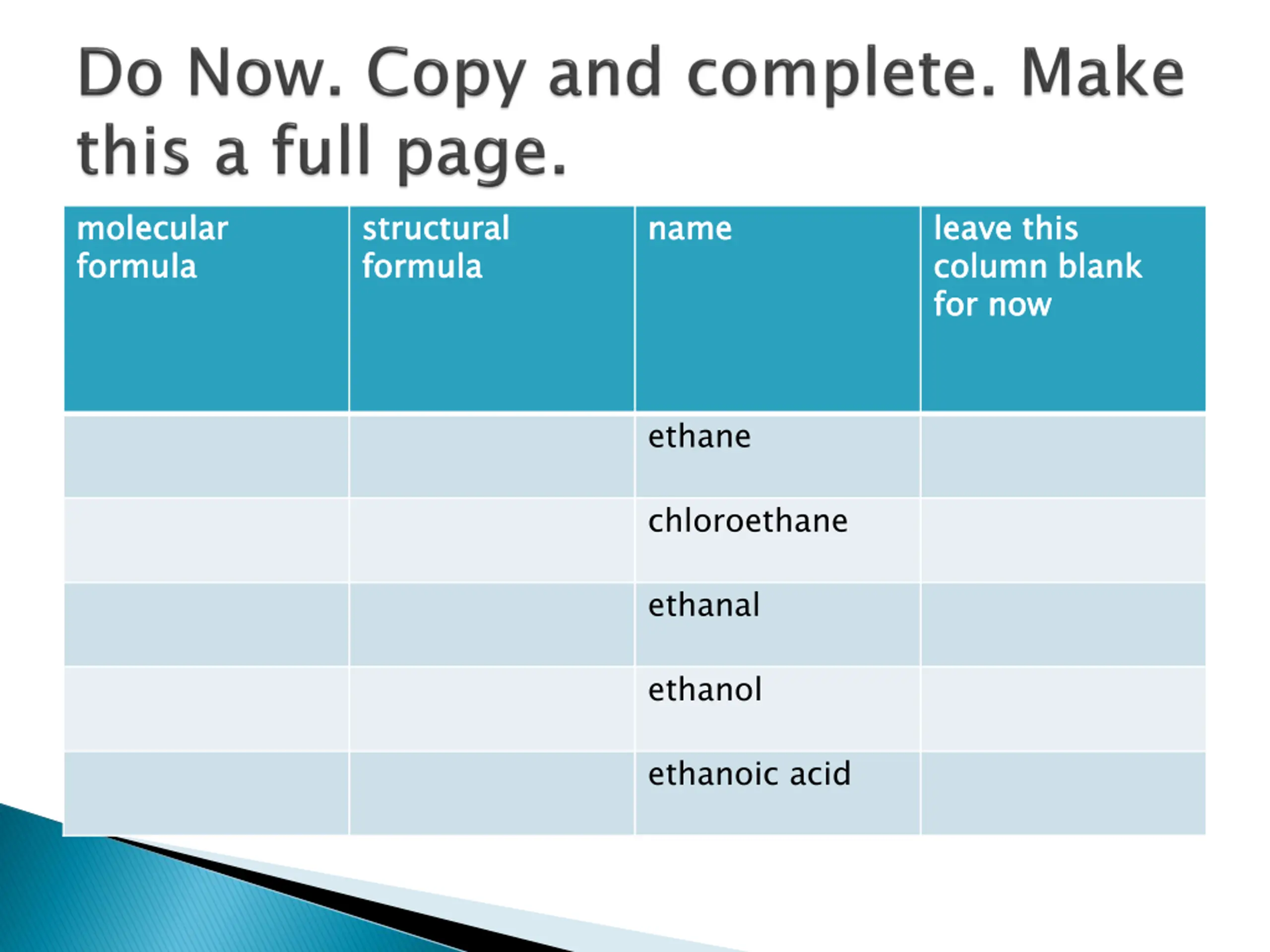 molecular formula molecular formula structural formula structural formula name name leave this column blank for now leave this column blank for now ethane chloroethane ethanal ethanol ethanoic acid