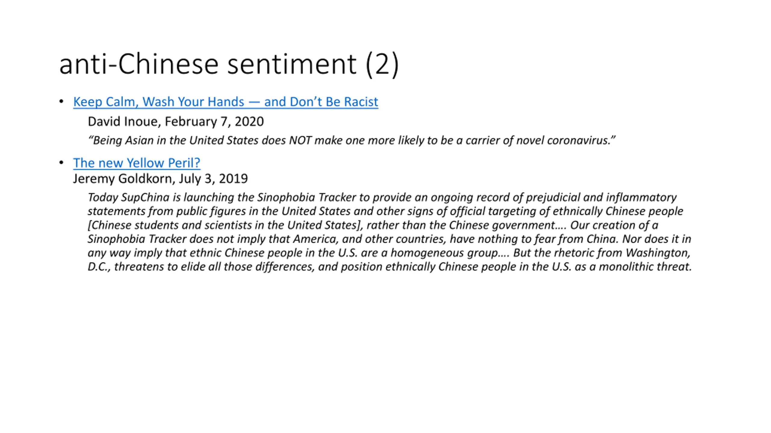 anti-Chinese sentiment (2) Keep Calm, Wash Your Hands and Don t Be Racist David Inoue, February 7, 2020 Being Asian in the United States does NOT make one more likely to be a carrier of novel coronavirus. The new Yellow Peril? Jeremy Goldkorn, July 3, 2019 Today SupChina is launching the Sinophobia Tracker to provide an ongoing record of prejudicial and inflammatory statements from public figures in the United States and other signs of official targeting of ethnically Chinese people [Chinese students and scientists in the United States], rather than the Chinese government . Our creation of a Sinophobia Tracker does not imply that America, and other countries, have nothing to fear from China. Nor does it in any way imply that ethnic Chinese people in the U.S. are a homogeneous group . But the rhetoric from Washington, D.C., threatens to elide all those differences, and position ethnically Chinese people in the U.S. as a monolithic threat.