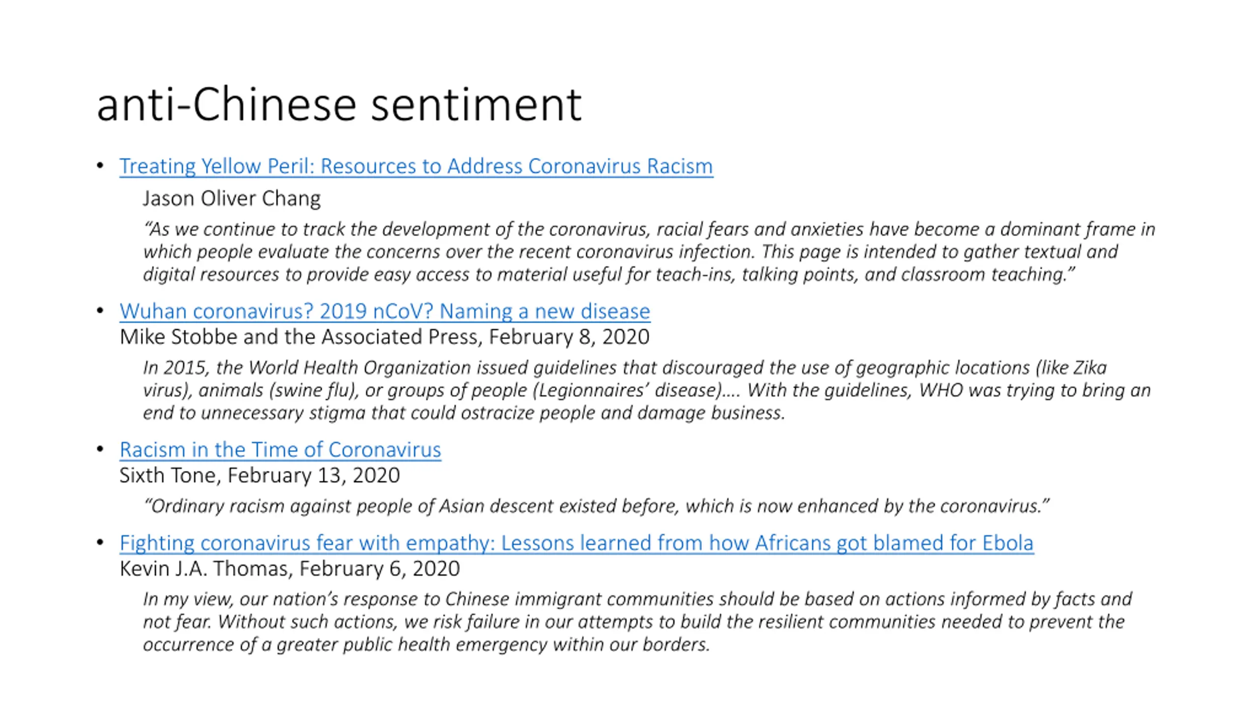 anti-Chinese sentiment Treating Yellow Peril: Resources to Address Coronavirus Racism Jason Oliver Chang As we continue to track the development of the coronavirus, racial fears and anxieties have become a dominant frame in which people evaluate the concerns over the recent coronavirus infection. This page is intended to gather textual and digital resources to provide easy access to material useful for teach-ins, talking points, and classroom teaching. Wuhan coronavirus? 2019 nCoV? Naming a new disease Mike Stobbe and the Associated Press, February 8, 2020 In 2015, the World Health Organization issued guidelines that discouraged the use of geographic locations (like Zika virus), animals (swine flu), or groups of people (Legionnaires disease) . With the guidelines, WHO was trying to bring an end to unnecessary stigma that could ostracize people and damage business. Racism in the Time of Coronavirus Sixth Tone, February 13, 2020 Ordinary racism against people of Asian descent existed before, which is now enhanced by the coronavirus. Fighting coronavirus fear with empathy: Lessons learned from how Africans got blamed for Ebola Kevin J.A. Thomas, February 6, 2020 In my view, our nation s response to Chinese immigrant communities should be based on actions informed by facts and not fear. Without such actions, we risk failure in our attempts to build the resilient communities needed to prevent the occurrence of a greater public health emergency within our borders.