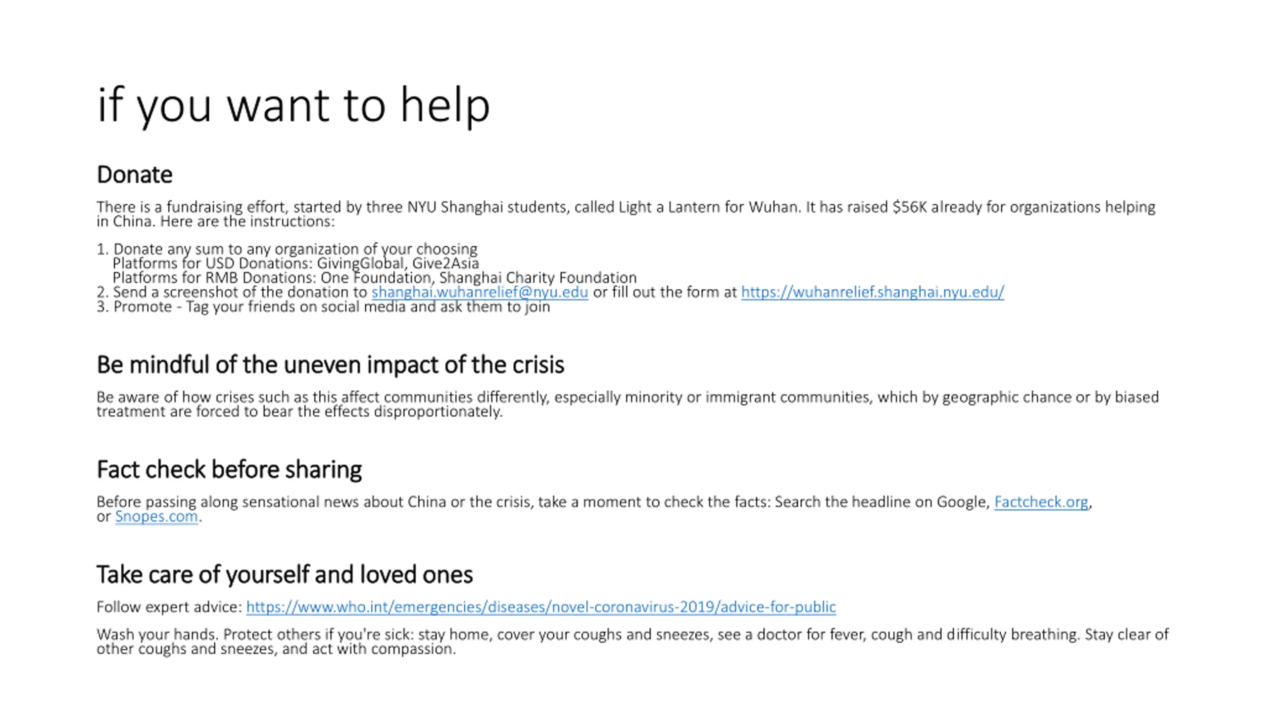 if you want to help Donate Donate There is a fundraising effort, started by three NYU Shanghai students, called Light a Lantern for Wuhan. It has raised $56K already for organizations helping in China. Here are the instructions: 1. Donate any sum to any organization of your choosing Platforms for USD Donations: GivingGlobal, Give2Asia Platforms for RMB Donations: One Foundation, Shanghai Charity Foundation 2. Send a screenshot of the donation to shanghai.wuhanrelief@nyu.edu or fill out the form at https://wuhanrelief.shanghai.nyu.edu/ 3. Promote - Tag your friends on social media and ask them to join Be mindful of the uneven impact of the crisis Be mindful of the uneven impact of the crisis Be aware of how crises such as this affect communities differently, especially minority or immigrant communities, which by geographic chance or by biased treatment are forced to bear the effects disproportionately. Fact check before sharing Fact check before sharing Before passing along sensational news about China or the crisis, take a moment to check the facts: Search the headline on Google, Factcheck.org, or Snopes.com. Take care of yourself and loved ones Take care of yourself and loved ones Follow expert advice: https://www.who.int/emergencies/diseases/novel-coronavirus-2019/advice-for-public Wash your hands. Protect others if you're sick: stay home, cover your coughs and sneezes, see a doctor for fever, cough and difficulty breathing. Stay clear of other coughs and sneezes, and act with compassion.