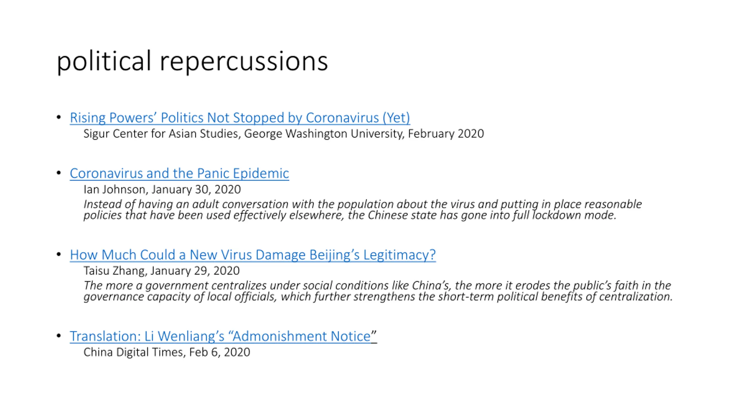 political repercussions Rising Powers Politics Not Stopped by Coronavirus (Yet) Sigur Center for Asian Studies, George Washington University, February 2020 Coronavirus and the Panic Epidemic Ian Johnson, January 30, 2020 Instead of having an adult conversation with the population about the virus and putting in place reasonable policies that have been used effectively elsewhere, the Chinese state has gone into full lockdown mode. How Much Could a New Virus Damage Beijing s Legitimacy? Taisu Zhang, January 29, 2020 The more a government centralizes under social conditions like China s, the more it erodes the public s faith in the governance capacity of local officials, which further strengthens the short-term political benefits of centralization. Translation: Li Wenliang s Admonishment Notice China Digital Times, Feb 6, 2020