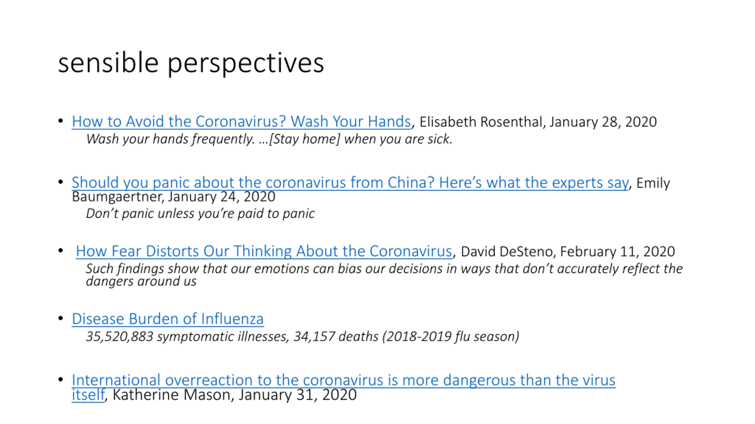 sensible perspectives How to Avoid the Coronavirus? Wash Your Hands, Elisabeth Rosenthal, January 28, 2020 Wash your hands frequently. [Stay home] when you are sick. Should you panic about the coronavirus from China? Here s what the experts say, Emily Baumgaertner, January 24, 2020 Don t panic unless you re paid to panic How Fear Distorts Our Thinking About the Coronavirus, David DeSteno, February 11, 2020 Such findings show that our emotions can bias our decisions in ways that don t accurately reflect the dangers around us Disease Burden of Influenza 35,520,883 symptomatic illnesses, 34,157 deaths (2018-2019 flu season) International overreaction to the coronavirus is more dangerous than the virus itself, Katherine Mason, January 31, 2020