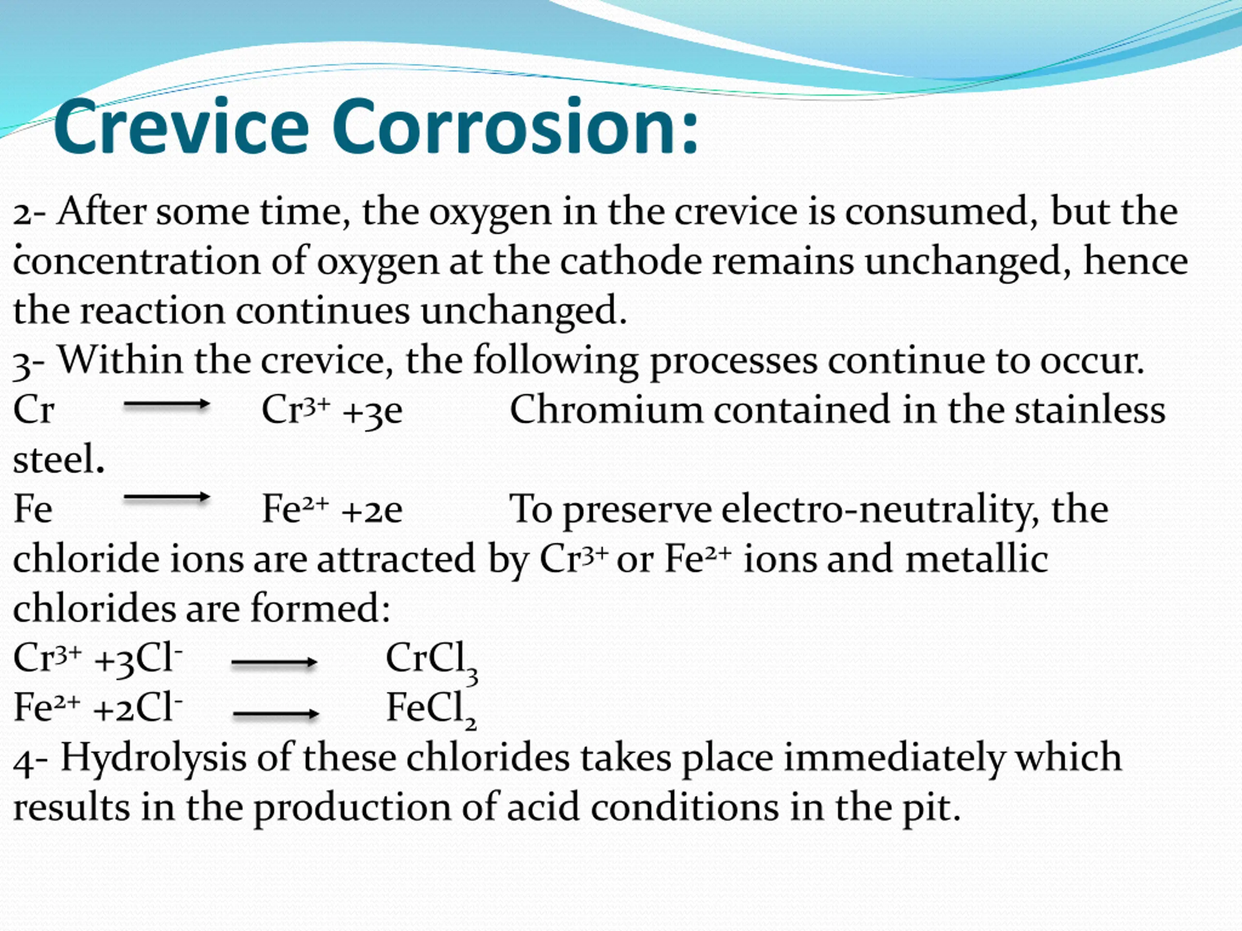 Crevice Corrosion: .2- After some time, the oxygen in the crevice is consumed, but the concentration of oxygen at the cathode remains unchanged, hence the reaction continues unchanged. 3- Within the crevice, the following processes continue to occur. Cr Cr3+ +3e Chromium contained in the stainless steel. Fe Fe2+ +2e To preserve electro-neutrality, the chloride ions are attracted by Cr3+ or Fe2+ ions and metallic chlorides are formed: Cr3+ +3Cl- CrCl3 Fe2+ +2Cl- FeCl2 4- Hydrolysis of these chlorides takes place immediately which results in the production of acid conditions in the pit.