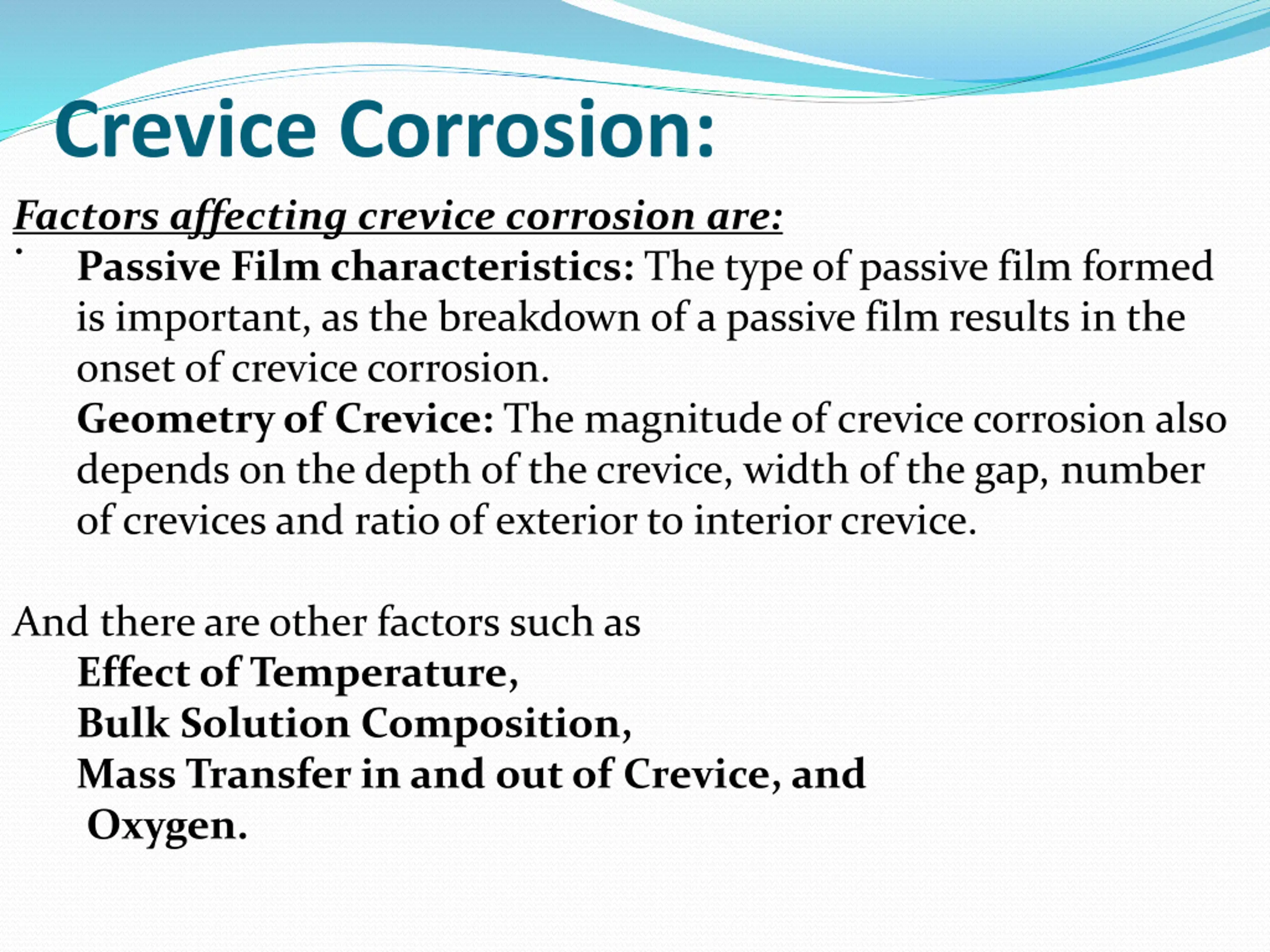 Crevice Corrosion: .Factors affecting crevice corrosion are: Passive Film characteristics: The type of passive film formed is important, as the breakdown of a passive film results in the onset of crevice corrosion. Geometry of Crevice: The magnitude of crevice corrosion also depends on the depth of the crevice, width of the gap, number of crevices and ratio of exterior to interior crevice. And there are other factors such as Effect of Temperature, Bulk Solution Composition, Mass Transfer in and out of Crevice, and Oxygen.
