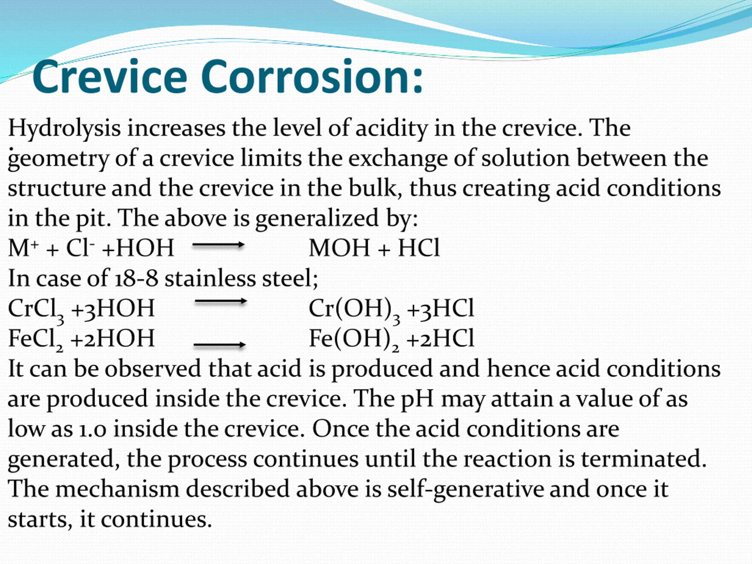 Crevice Corrosion: .Hydrolysis increases the level of acidity in the crevice. The geometry of a crevice limits the exchange of solution between the structure and the crevice in the bulk, thus creating acid conditions in the pit. The above is generalized by: M+ + Cl- +HOH MOH + HCl In case of 18-8 stainless steel; CrCl3 +3HOH Cr(OH)3 +3HCl FeCl2 +2HOH Fe(OH)2 +2HCl It can be observed that acid is produced and hence acid conditions are produced inside the crevice. The pH may attain a value of as low as 1.0 inside the crevice. Once the acid conditions are generated, the process continues until the reaction is terminated. The mechanism described above is self-generative and once it starts, it continues.