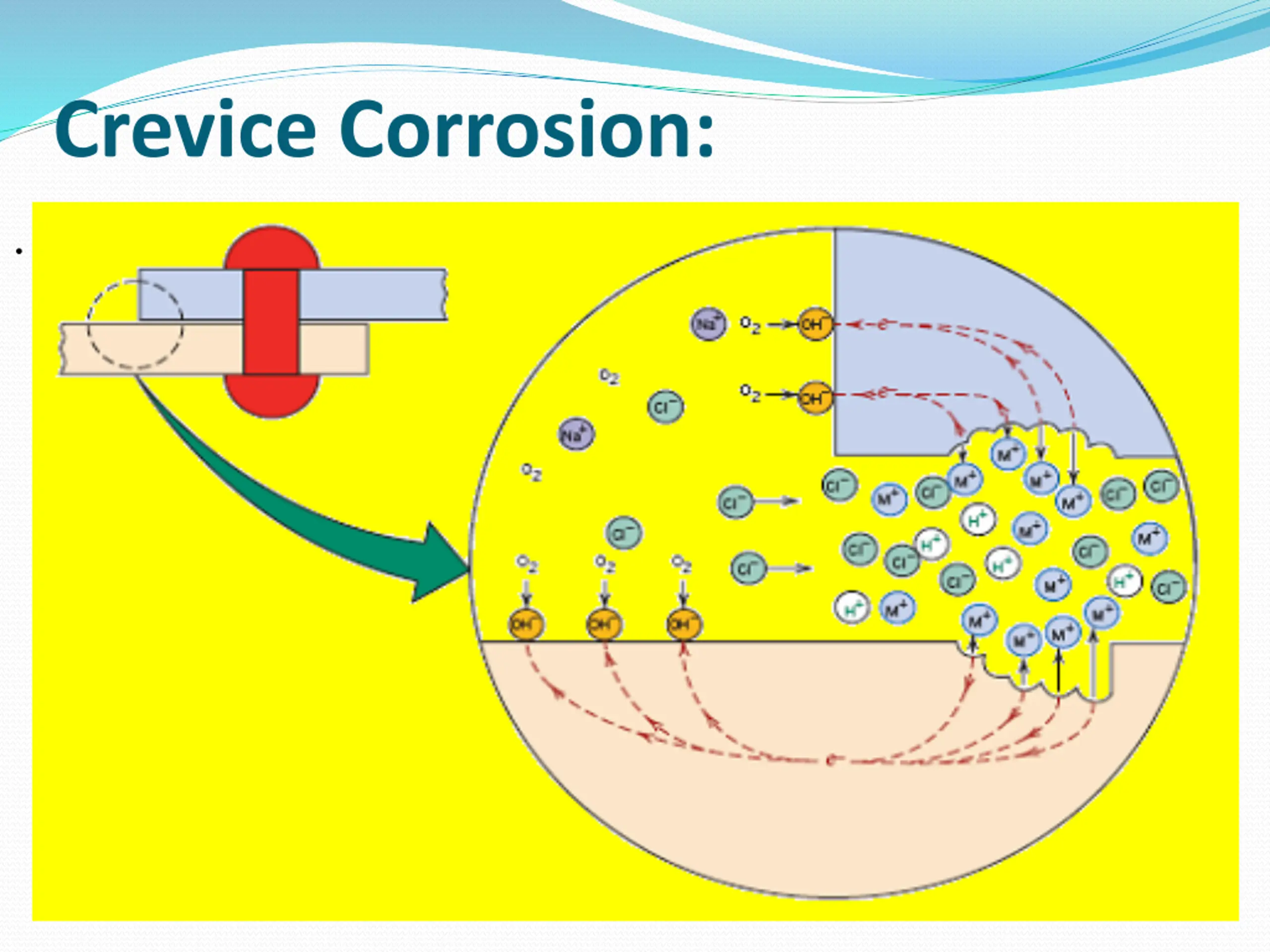 Crevice Corrosion: .Mechanism of Crevice Corrosion: The phenomenon of crevice corrosion is extremely complex. Most of the mechanism is based on certain type of concentration cells. A difference in metal ions exists between the crevice and the outside, a corrosion cell is formed. The area with low metal concentration becomes the anode and the other cathode. A high concentration of oxygen on the surface outside the crevice and a low oxygen concentration inside a crevice create a differential aeration cell, which initiates crevice corrosion. The mechanism is as follow: 1- Anode M Cathode O2 +H2O +2e- oxygen reduction outside the crevice M++ +2e- 2OH-