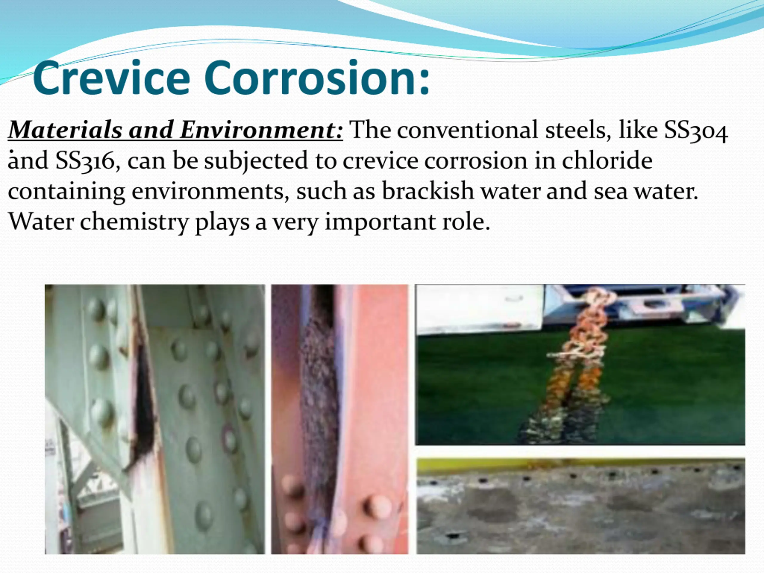 Crevice Corrosion: .Materials and Environment: The conventional steels, like SS304 and SS316, can be subjected to crevice corrosion in chloride containing environments, such as brackish water and sea water. Water chemistry plays a very important role.