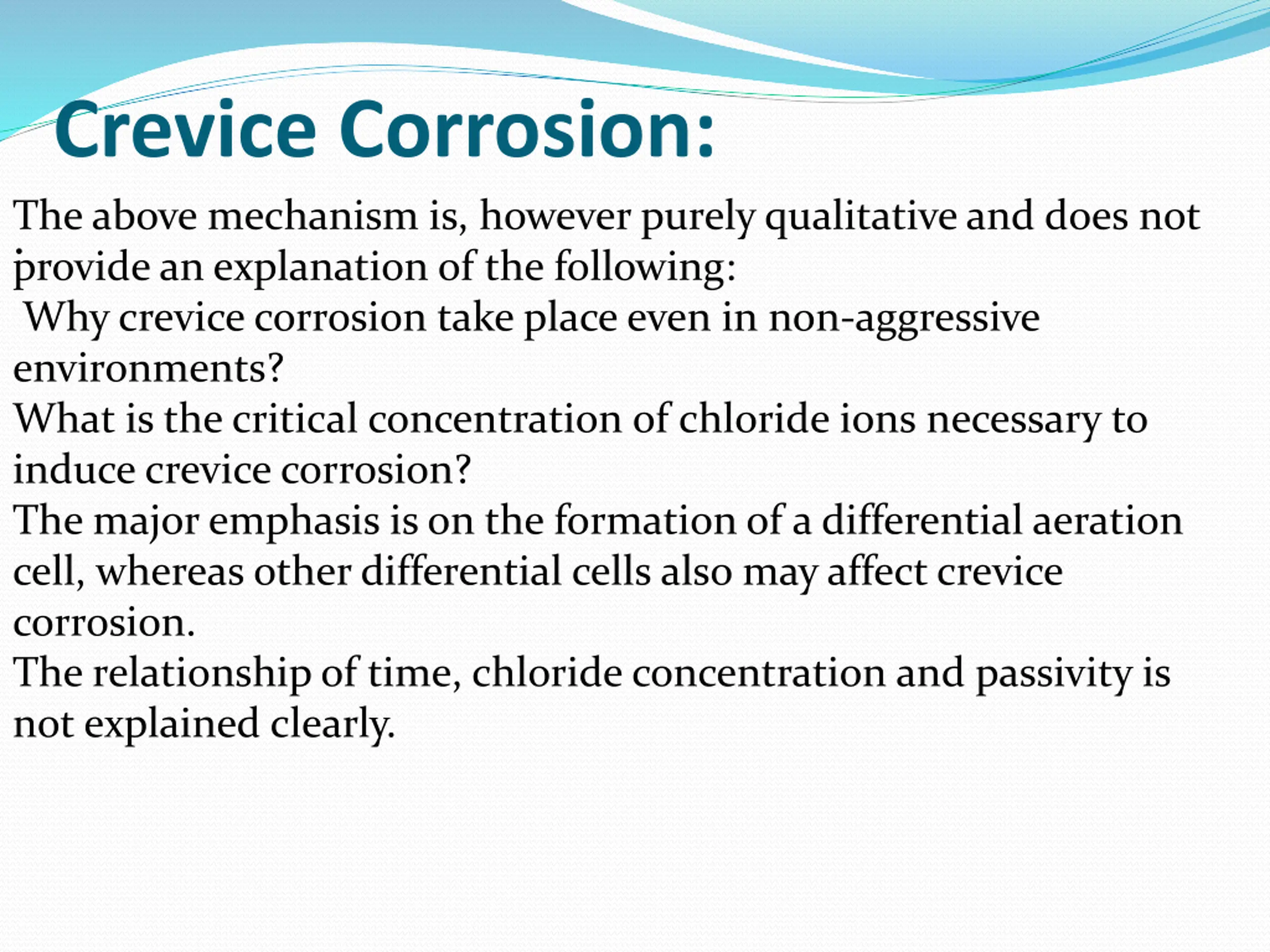 Crevice Corrosion: .The above mechanism is, however purely qualitative and does not provide an explanation of the following: Why crevice corrosion take place even in non-aggressive environments? What is the critical concentration of chloride ions necessary to induce crevice corrosion? The major emphasis is on the formation of a differential aeration cell, whereas other differential cells also may affect crevice corrosion. The relationship of time, chloride concentration and passivity is not explained clearly.