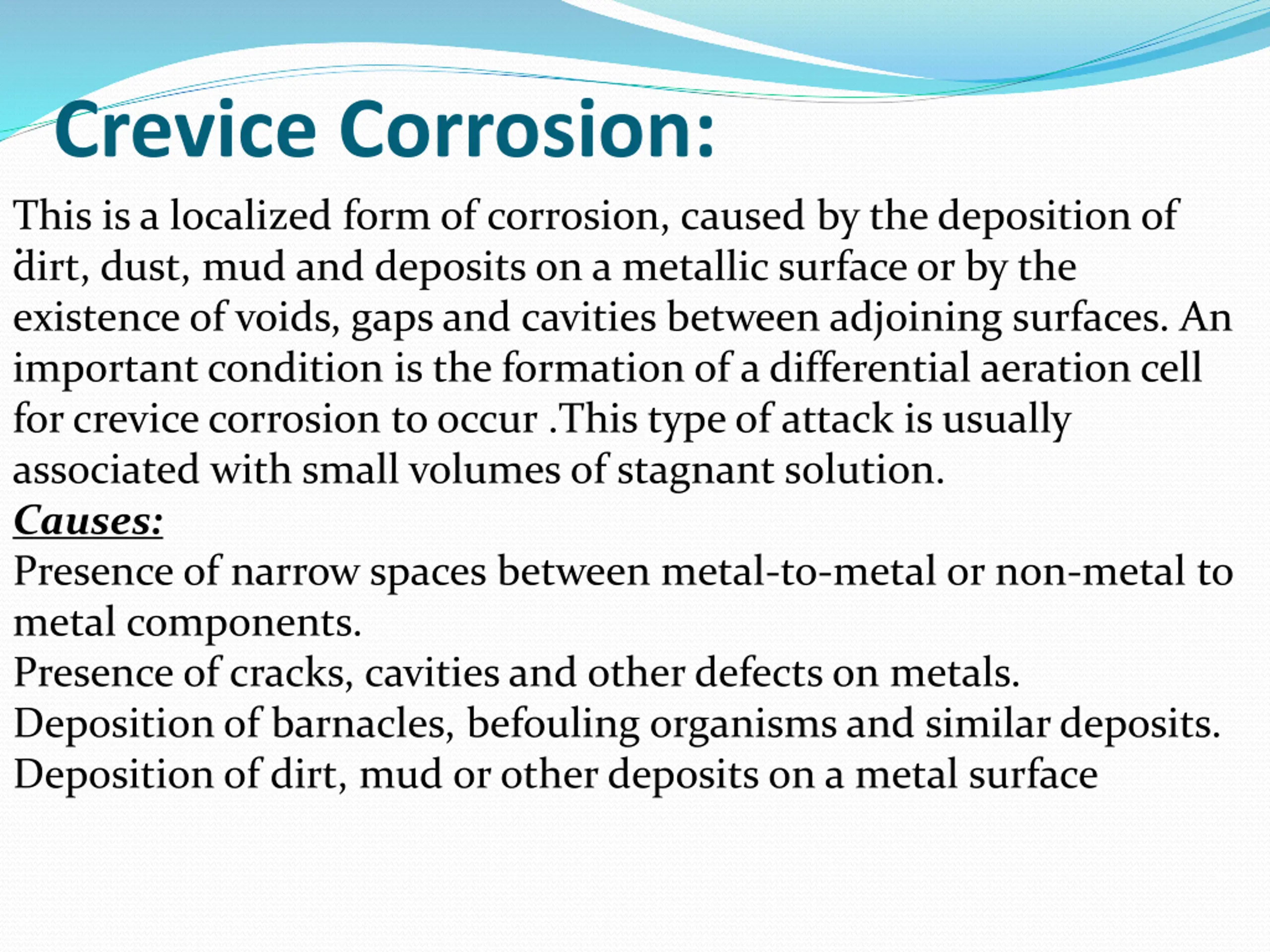 Crevice Corrosion: .This is a localized form of corrosion, caused by the deposition of dirt, dust, mud and deposits on a metallic surface or by the existence of voids, gaps and cavities between adjoining surfaces. An important condition is the formation of a differential aeration cell for crevice corrosion to occur .This type of attack is usually associated with small volumes of stagnant solution. Causes: Presence of narrow spaces between metal-to-metal or non-metal to metal components. Presence of cracks, cavities and other defects on metals. Deposition of barnacles, befouling organisms and similar deposits. Deposition of dirt, mud or other deposits on a metal surface