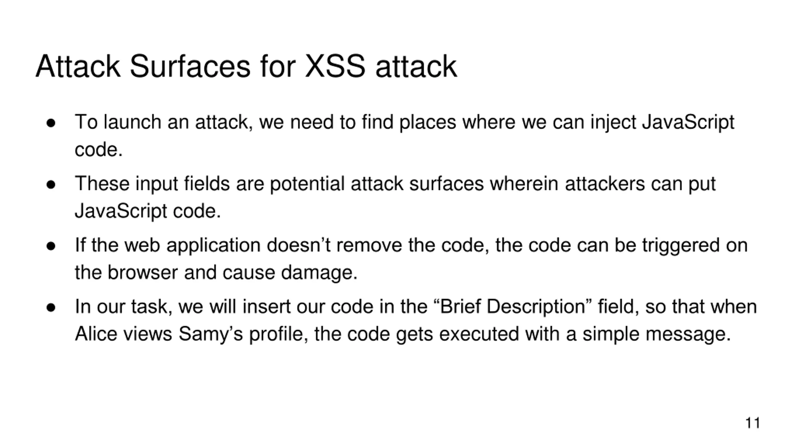 Attack Surfaces for XSS attack To launch an attack, we need to find places where we can inject JavaScript code. These input fields are potential attack surfaces wherein attackers can put JavaScript code. If the web application doesn t remove the code, the code can be triggered on the browser and cause damage. In our task, we will insert our code in the Brief Description field, so that when Alice views Samy s profile, the code gets executed with a simple message. 11
