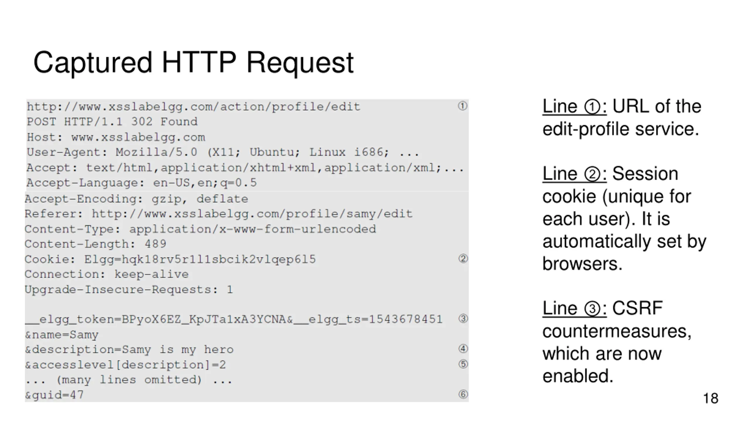 Captured HTTP Request Line : URL of the edit-profile service. Line : Session cookie (unique for each user). It is automatically set by browsers. Line : CSRF countermeasures, which are now enabled. 18