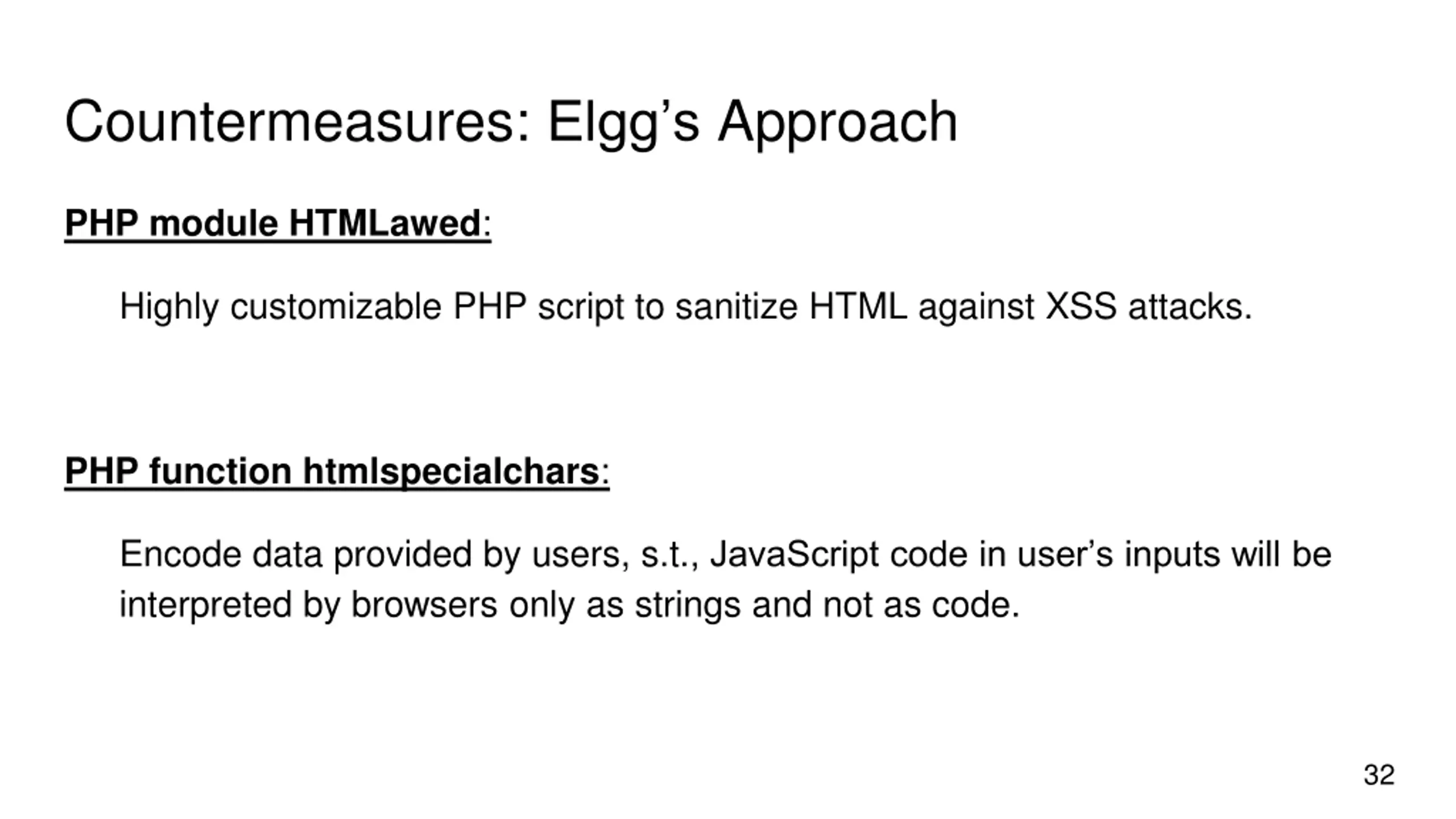 Countermeasures: Elggs Approach PHP module HTMLawed: Highly customizable PHP script to sanitize HTML against XSS attacks. PHP function htmlspecialchars: Encode data provided by users, s.t., JavaScript code in user s inputs will be interpreted by browsers only as strings and not as code. 32