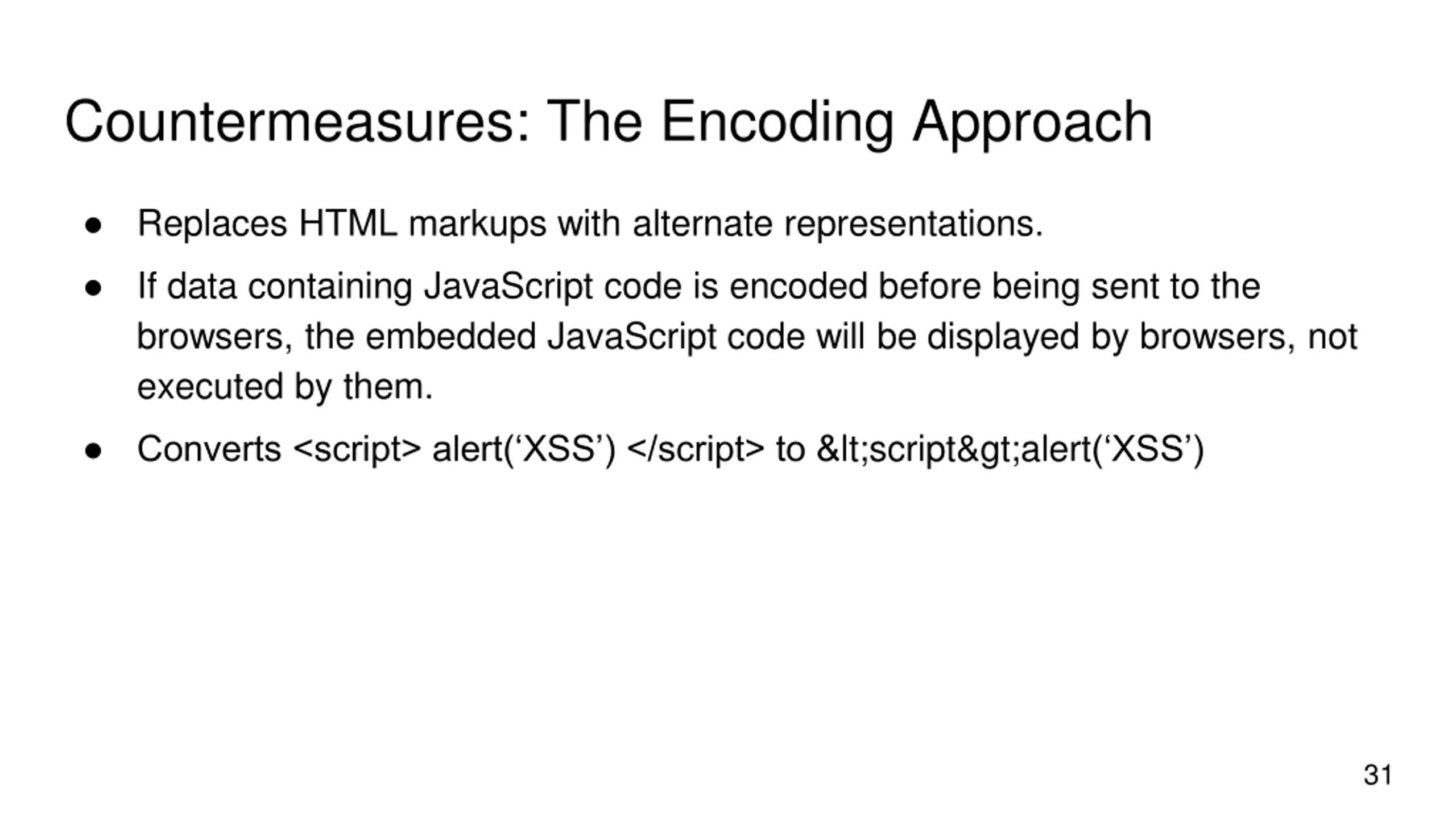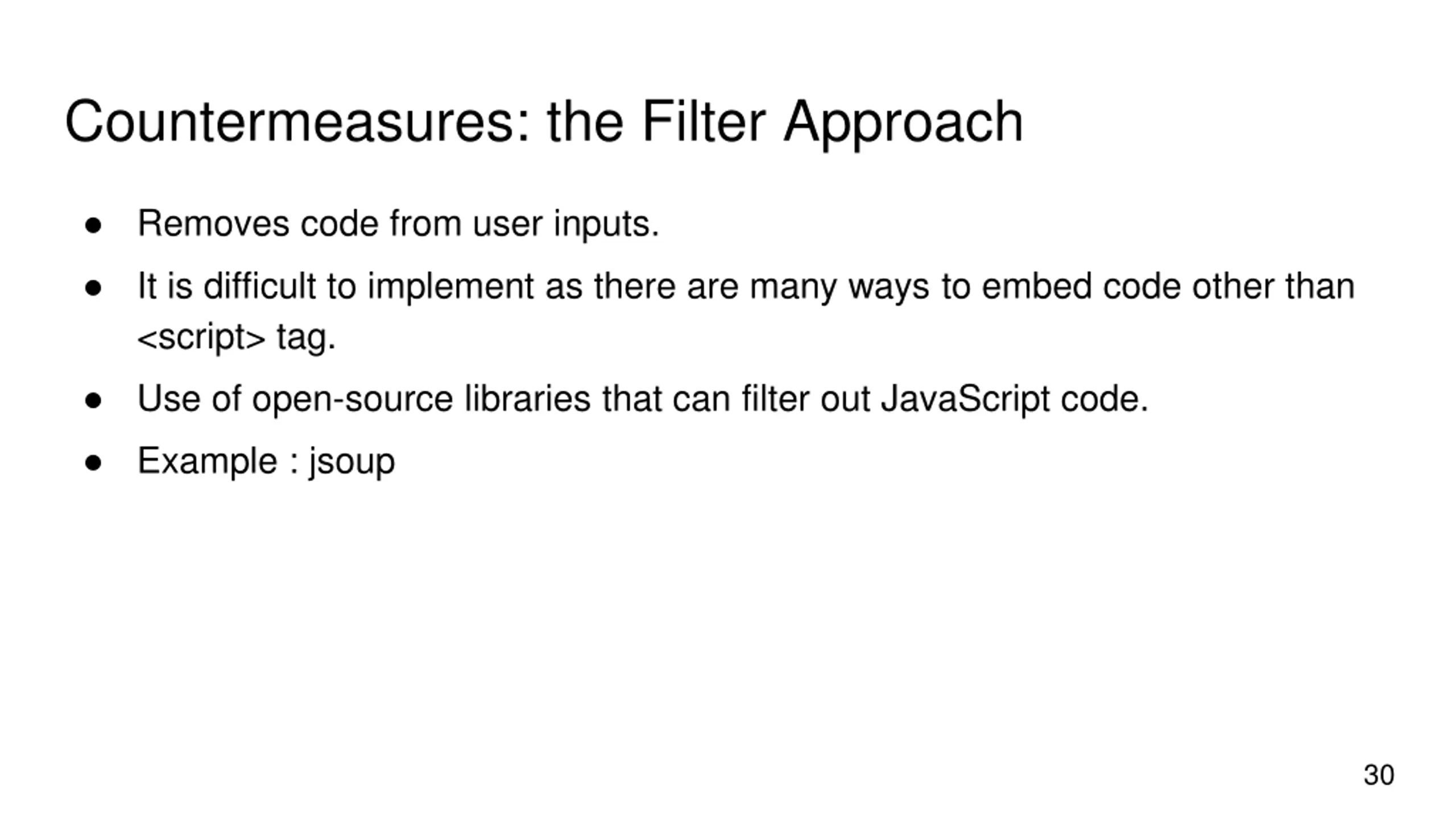 Countermeasures: the Filter Approach Removes code from user inputs. It is difficult to implement as there are many ways to embed code other than <script> tag. Use of open-source libraries that can filter out JavaScript code. Example : jsoup 30