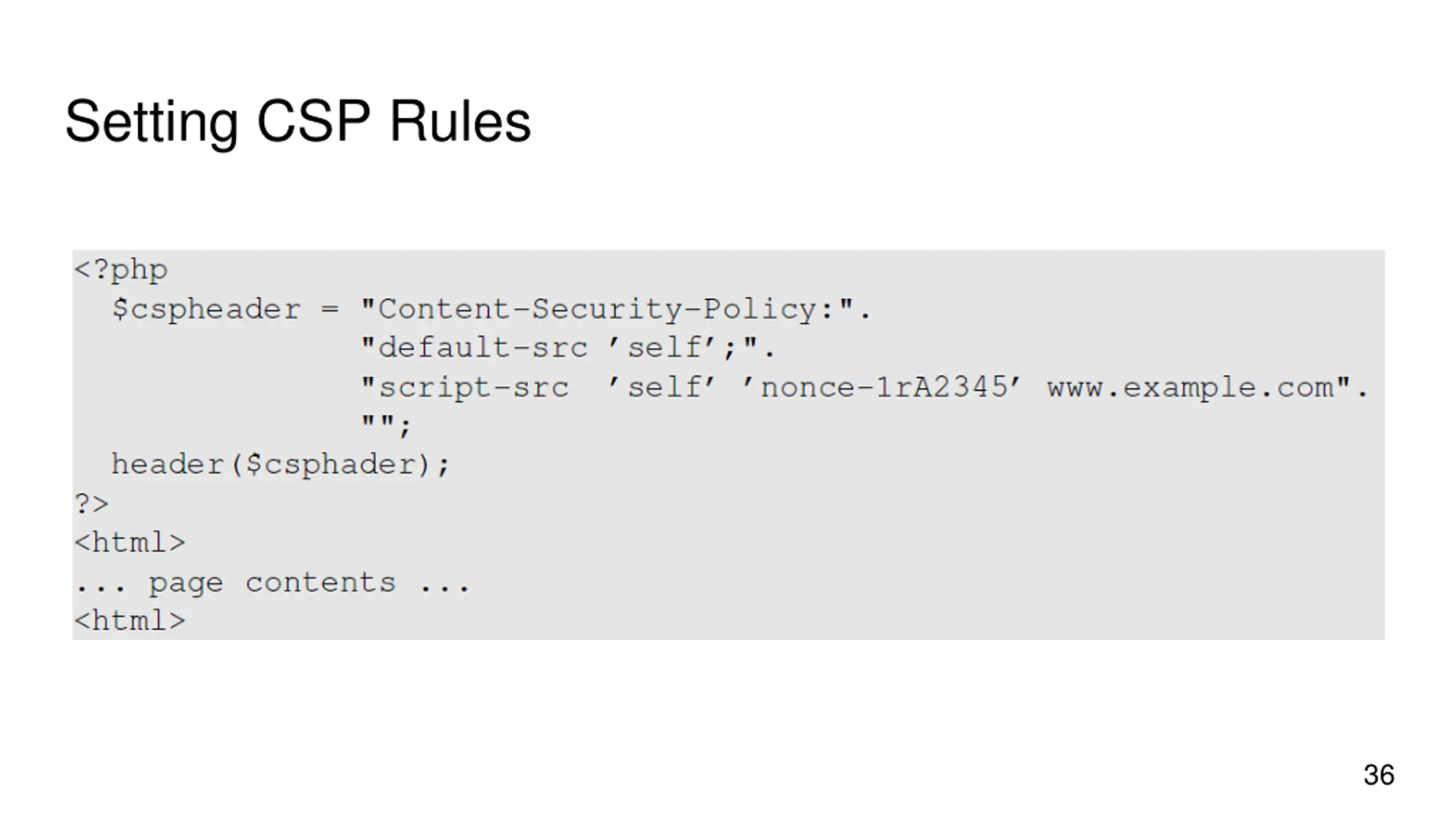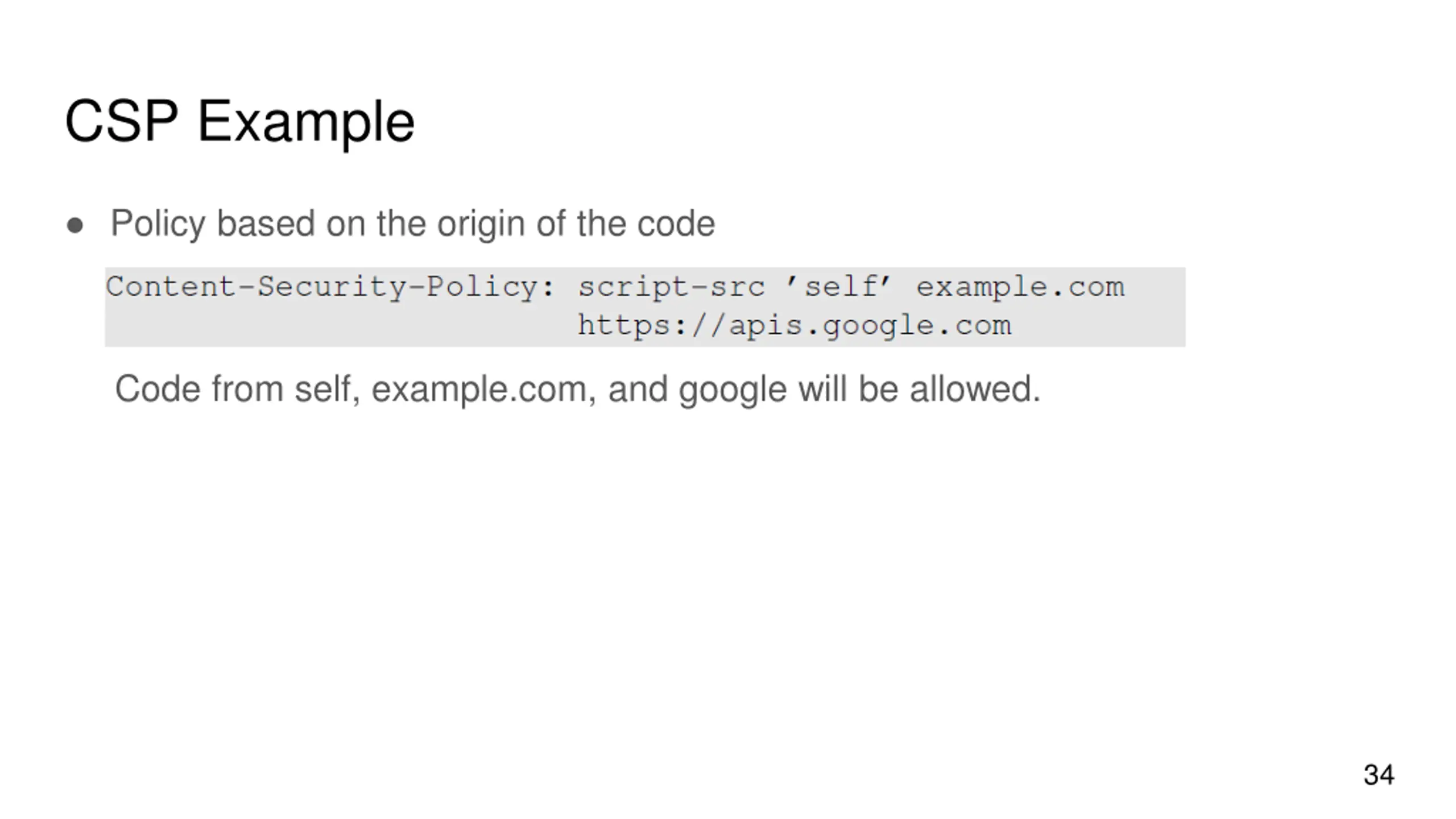 CSP Example Policy based on the origin of the code Code from self, example.com, and google will be allowed. 34