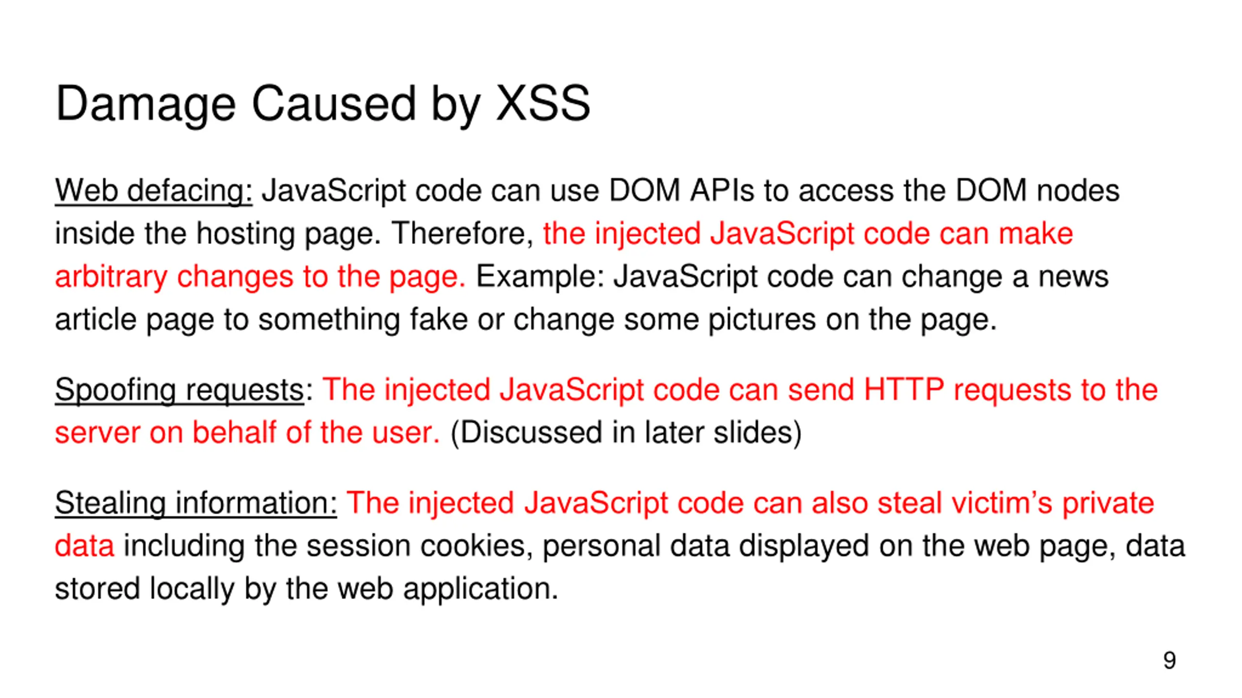 Damage Caused by XSS Web defacing: JavaScript code can use DOM APIs to access the DOM nodes inside the hosting page. Therefore, the injected JavaScript code can make arbitrary changes to the page. Example: JavaScript code can change a news article page to something fake or change some pictures on the page. Spoofing requests: The injected JavaScript code can send HTTP requests to the server on behalf of the user. (Discussed in later slides) Stealing information: The injected JavaScript code can also steal victim s private data including the session cookies, personal data displayed on the web page, data stored locally by the web application. 9