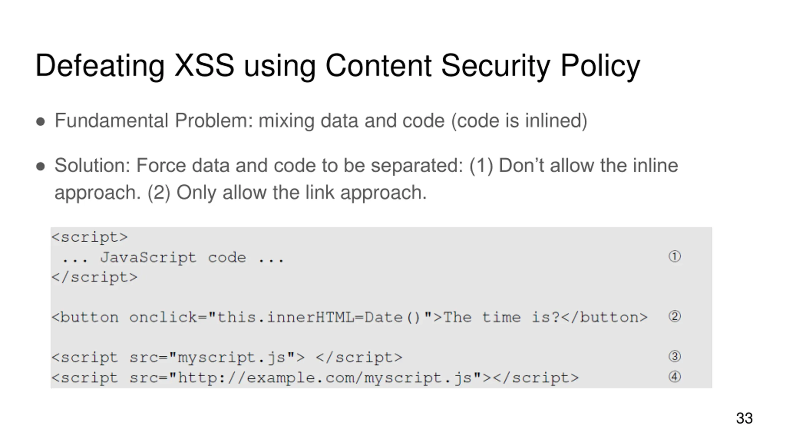 Defeating XSS using Content Security Policy Fundamental Problem: mixing data and code (code is inlined) Solution: Force data and code to be separated: (1) Don t allow the inline approach. (2) Only allow the link approach. 33