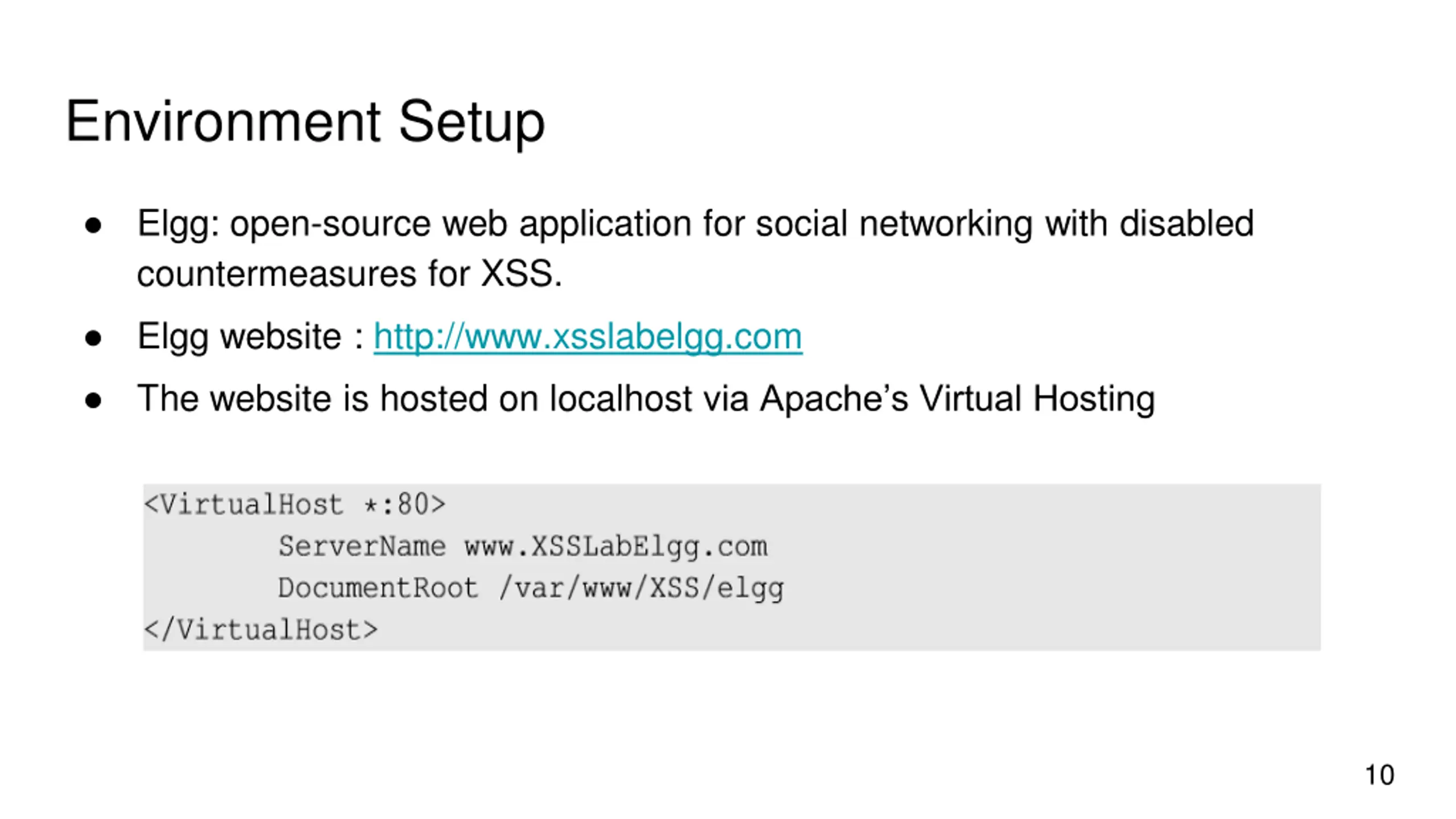 Environment Setup Elgg: open-source web application for social networking with disabled countermeasures for XSS. Elgg website : http://www.xsslabelgg.com The website is hosted on localhost via Apache s Virtual Hosting 10
