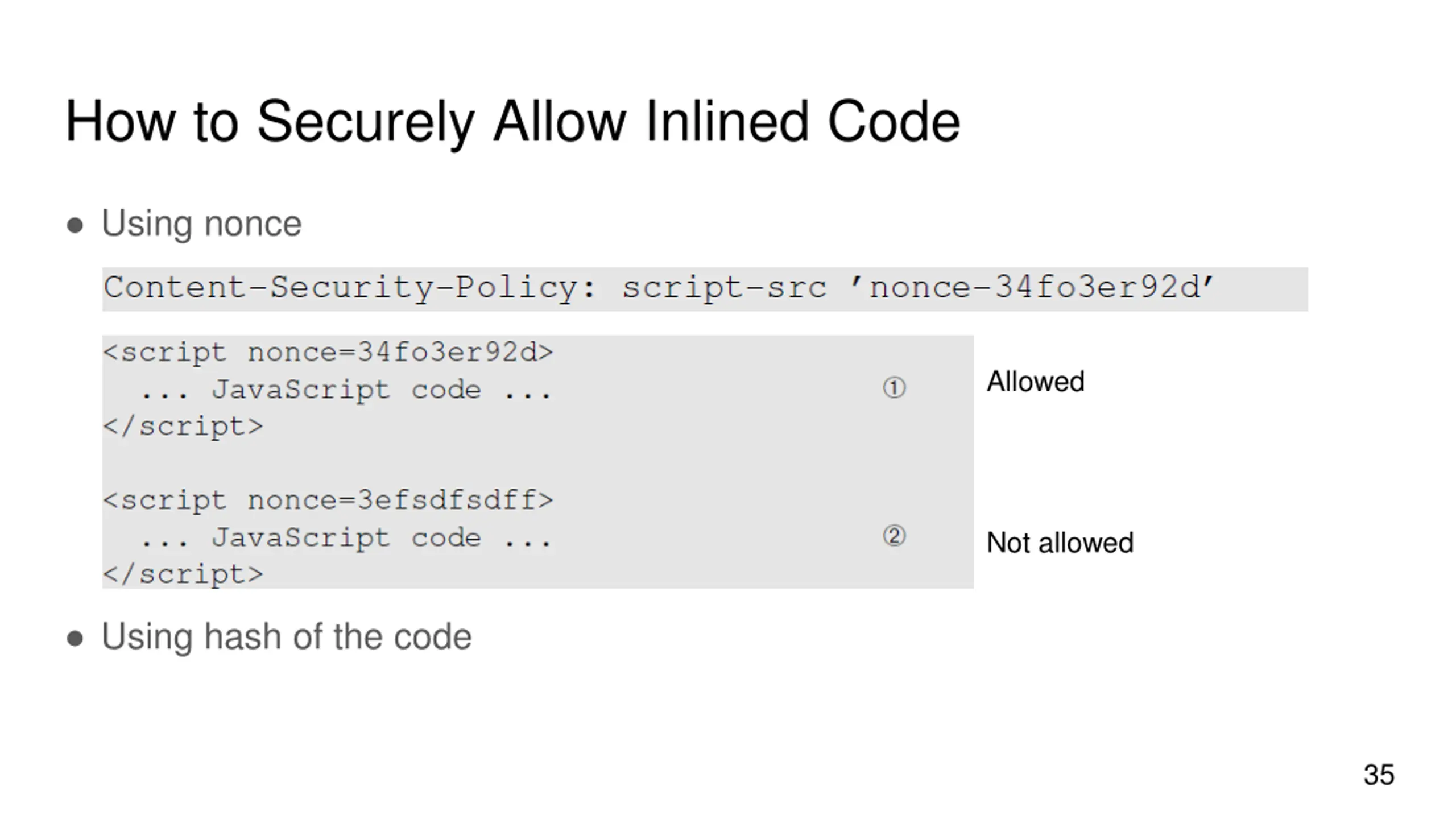 How to Securely Allow Inlined Code Using nonce Allowed Not allowed Using hash of the code 35